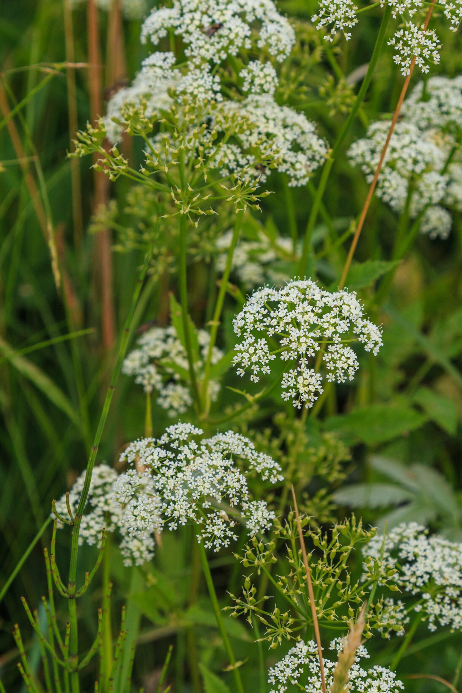 - Вёх ядовитый (Cicuta virosa) — Опасно: сильное отравление, чаще растёт у воды, корневище с полостями, листья более узкие и ажурные.