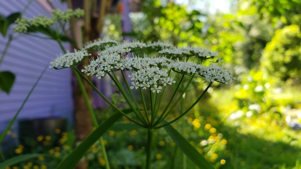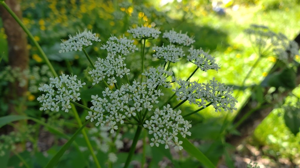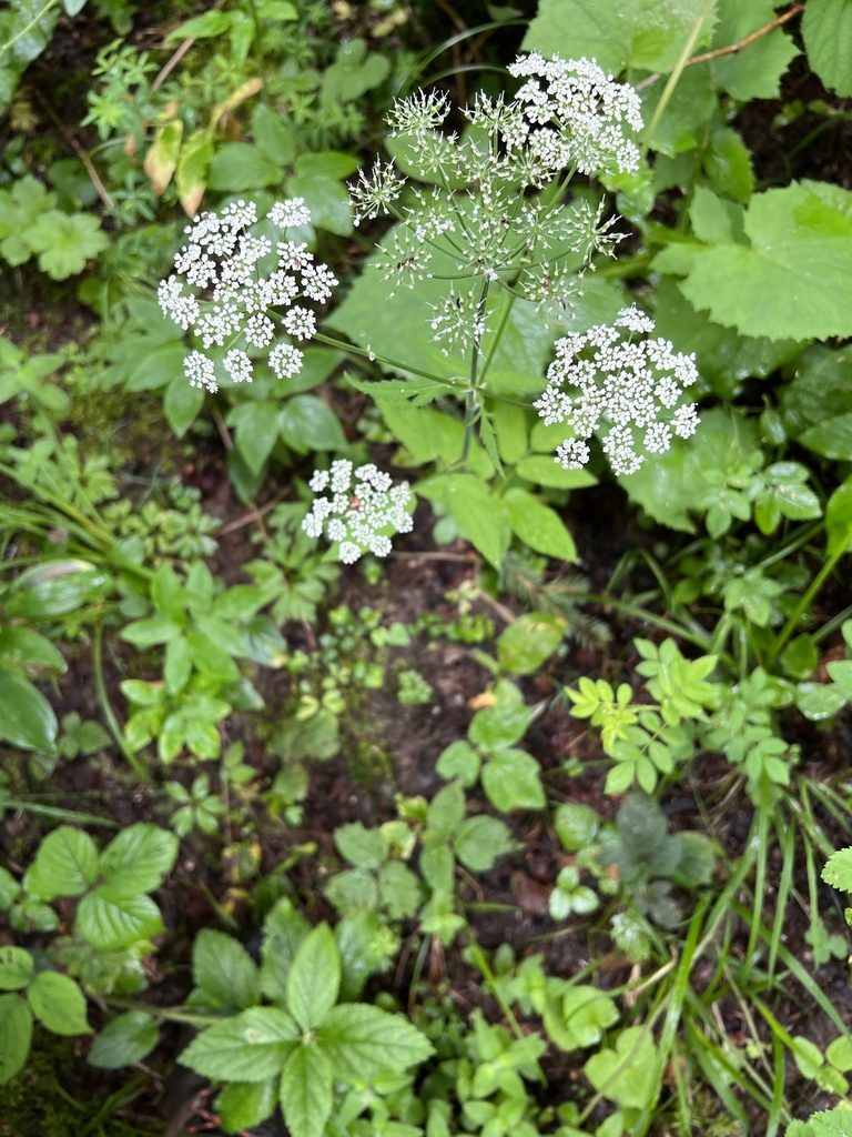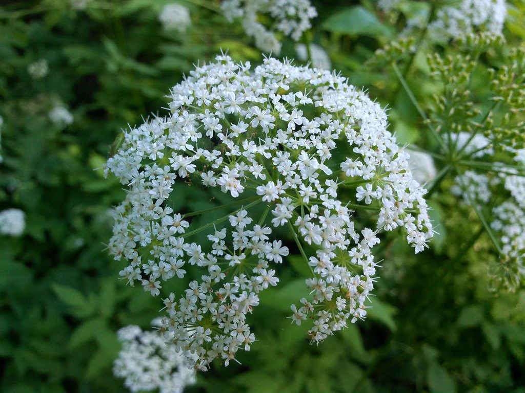- Болиголов пятнистый (Conium maculatum) — Опасно: тяжёлое отравление, стебель с фиолетовыми пятнами и резким “мышиным” запахом, листья более тонко рассечённые.