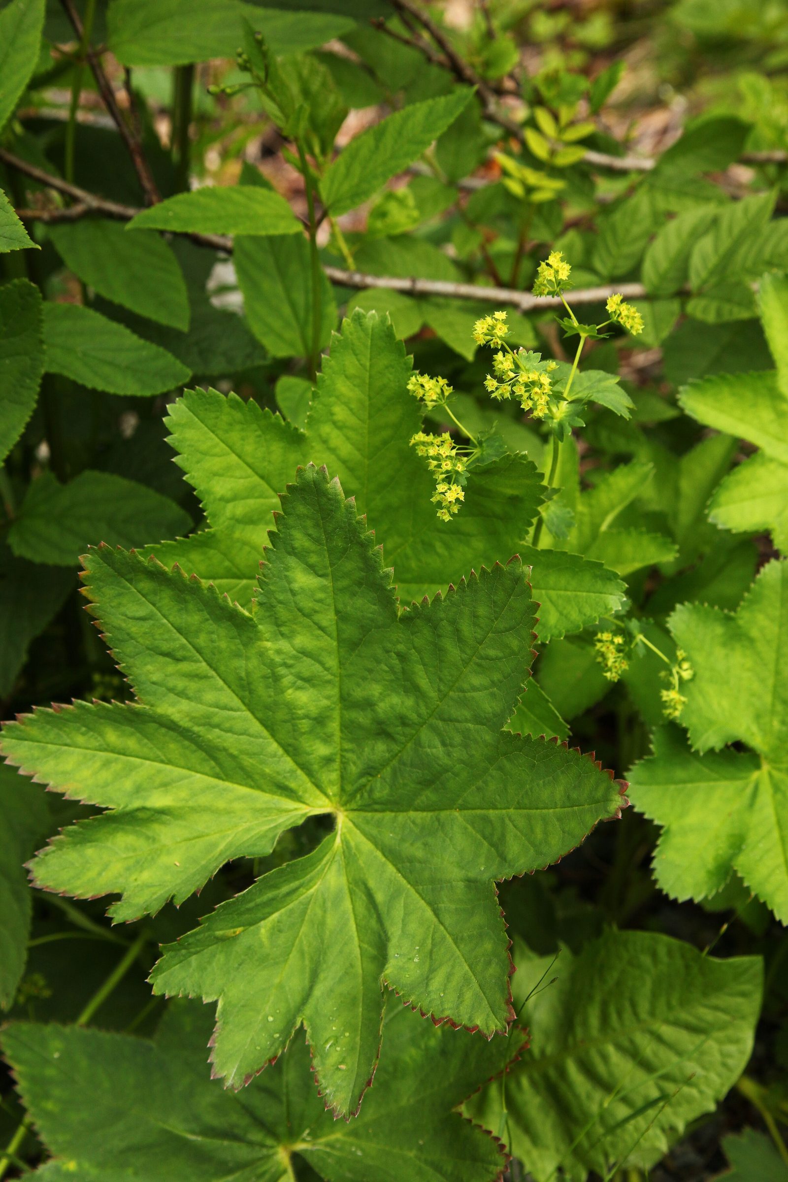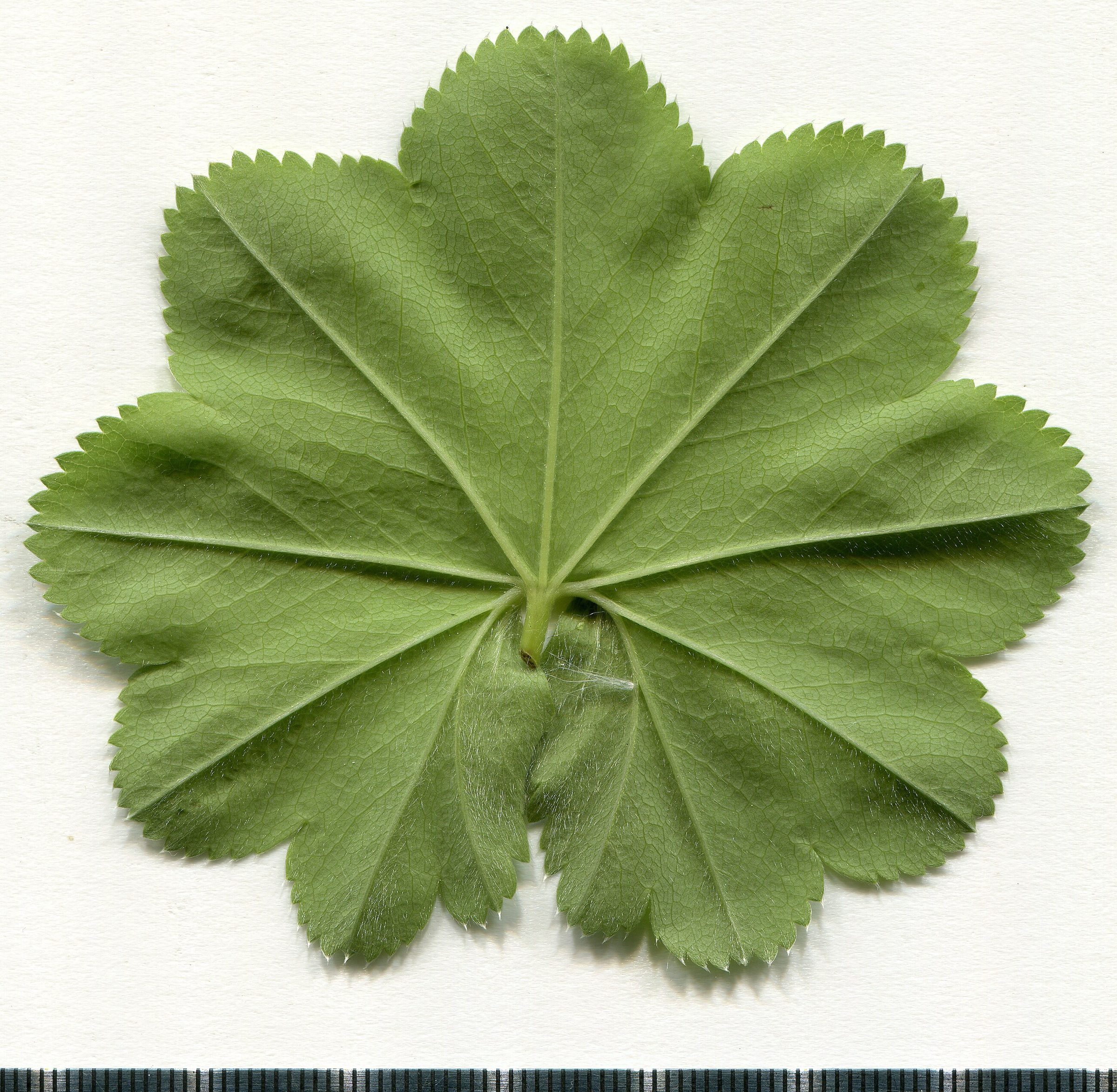 Листья округло-почковидные, веерообразные, с радиальными складками и 7–11 лопастями по краю. Поверхность чаще слегка опушённая, по краю заметны зубчики, из-за которых лист напоминает “манжету”.