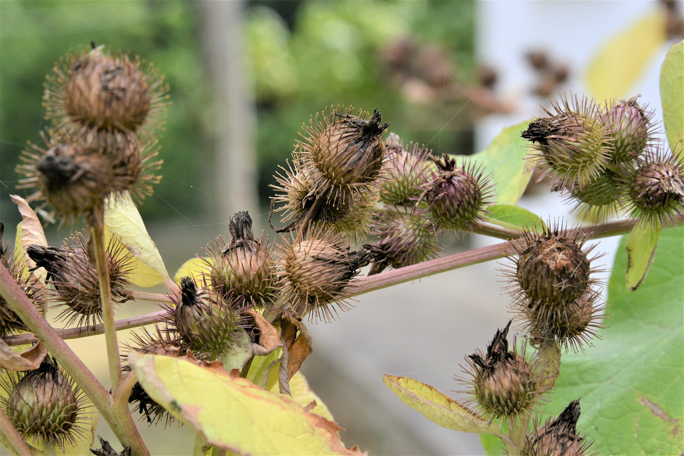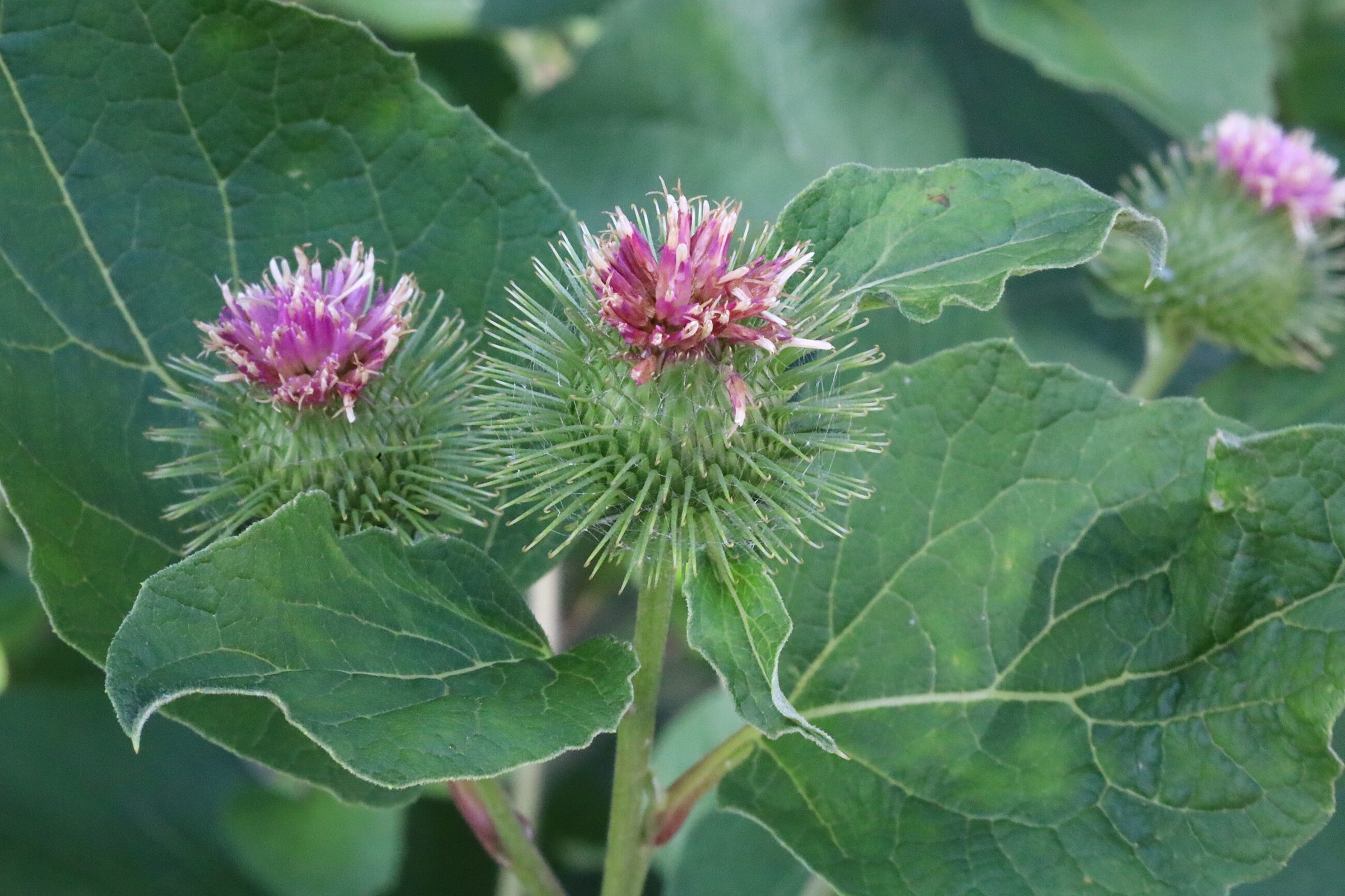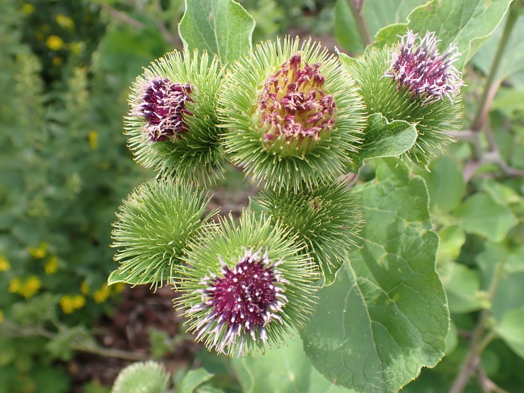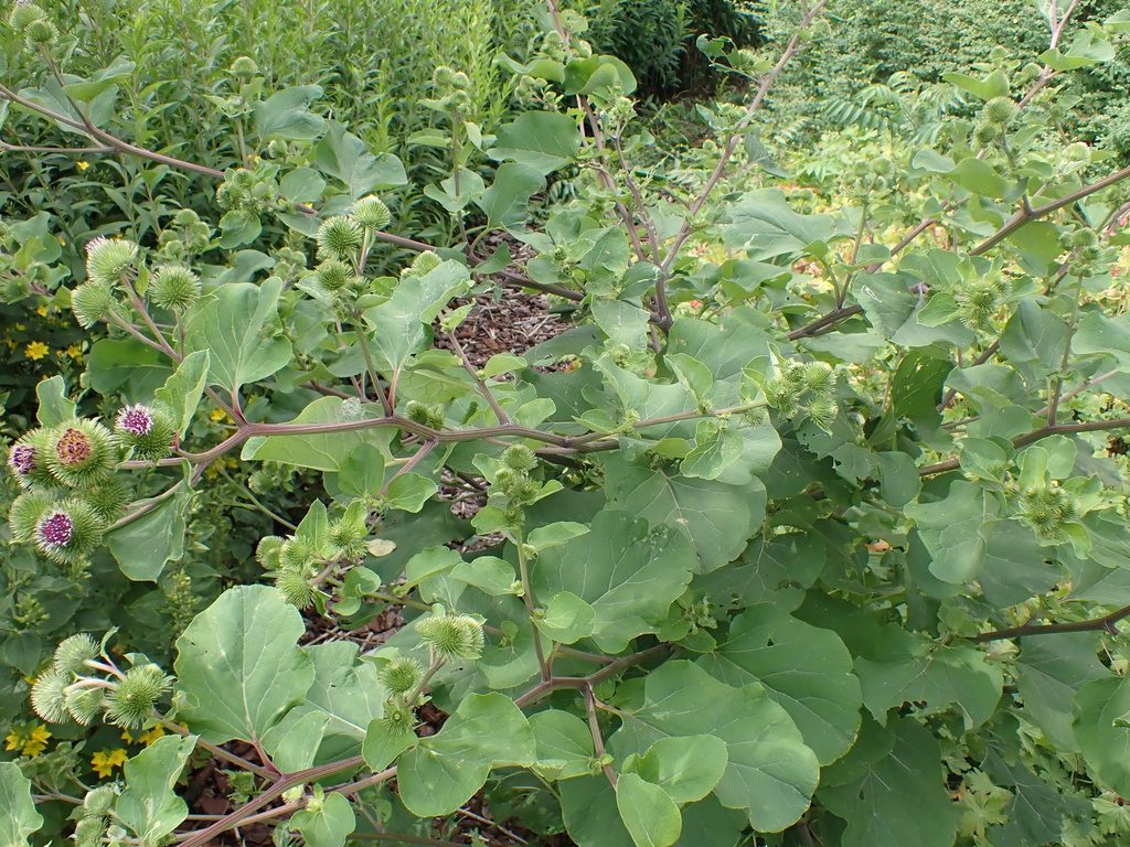 - Как узнать: крупные сердцевидные листья с сероватым опушением снизу и шаровидные «репьи» с крючками.