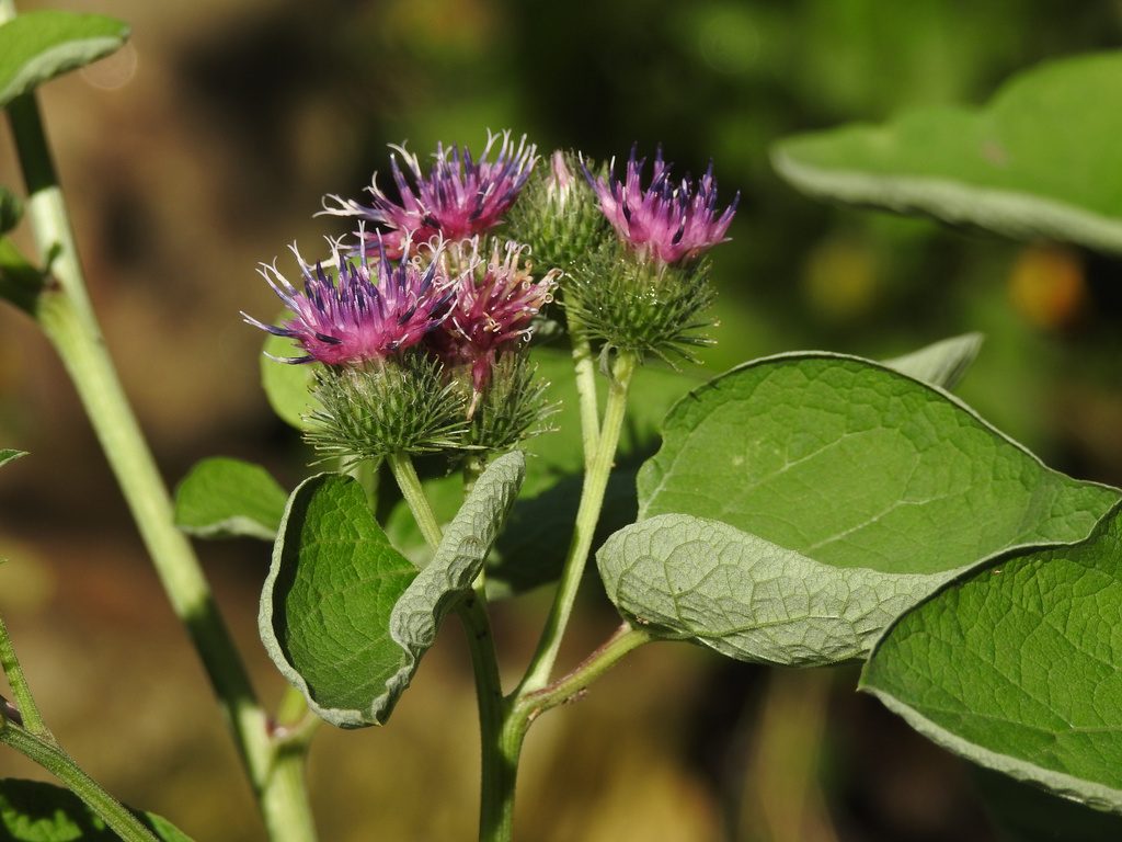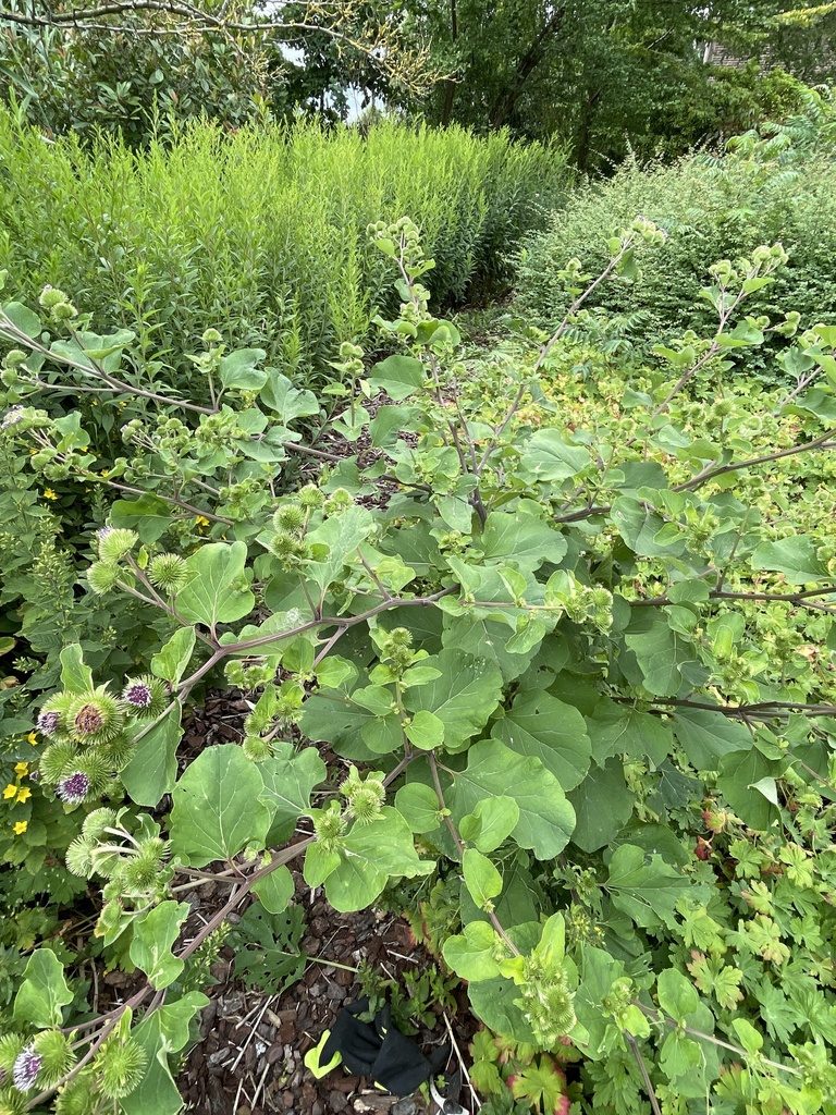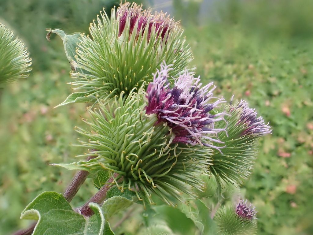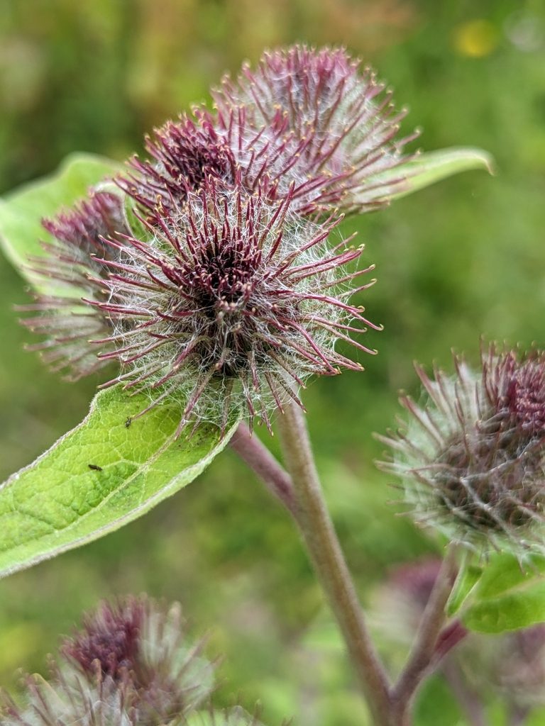 - Как узнать: крупные сердцевидные листья с сероватым опушением снизу и шаровидные «репьи» с крючками.