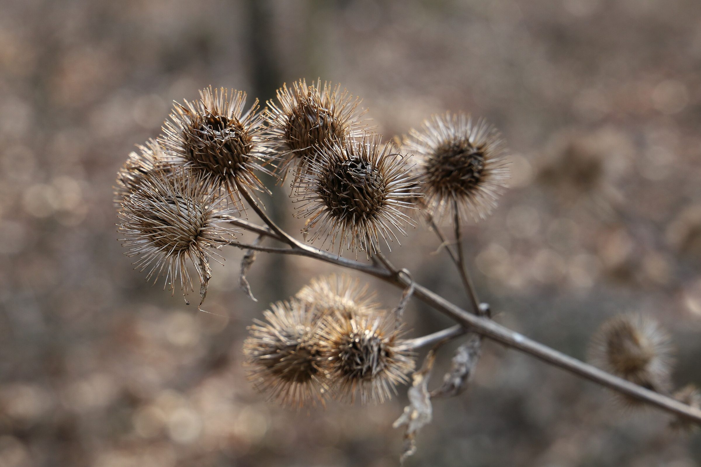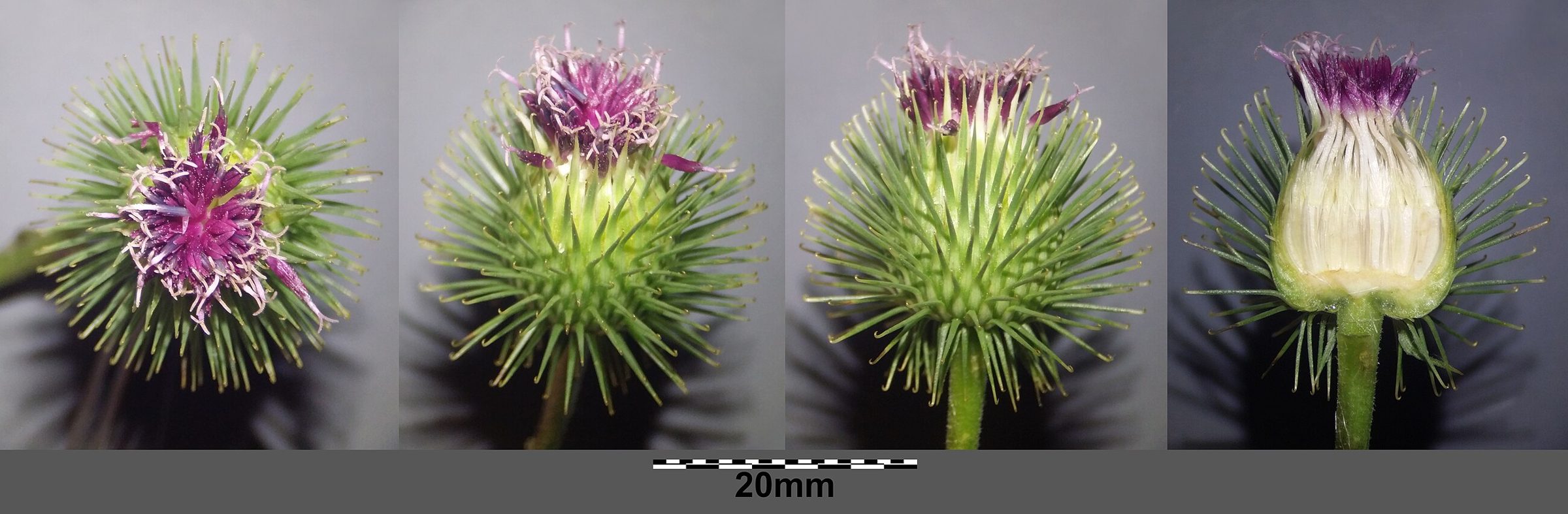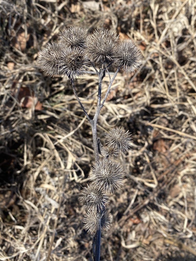 Во второй год растение даёт высокий стебель и шаровидные корзинки, которые после цветения превращаются в «репьи» с крючками. Эти сухие головки цепляются к одежде и шерсти и часто остаются рядом с растением.
