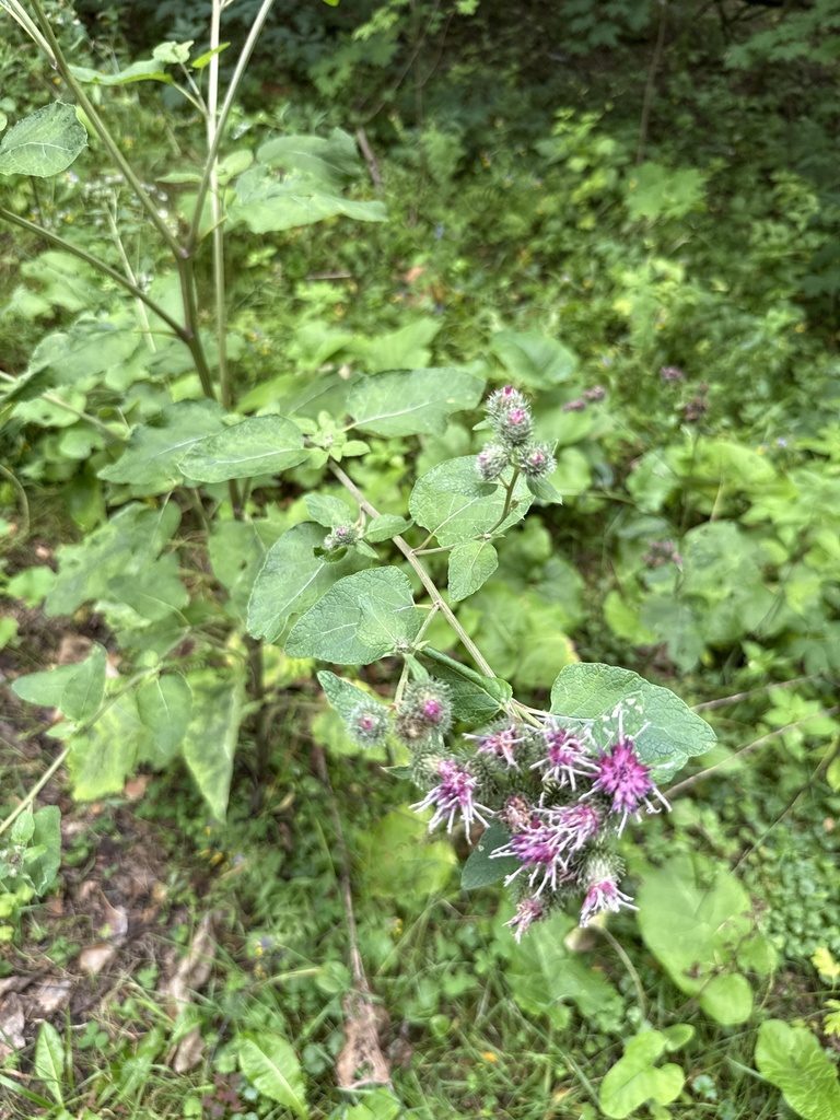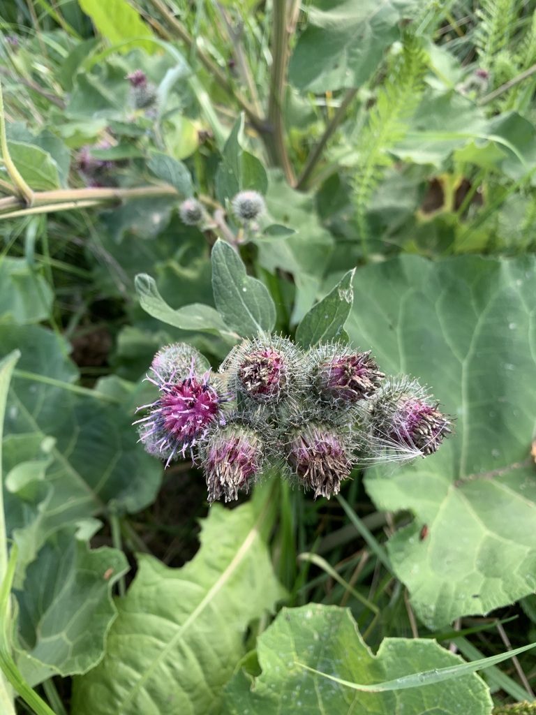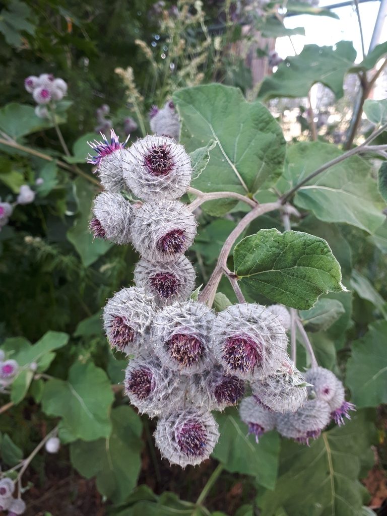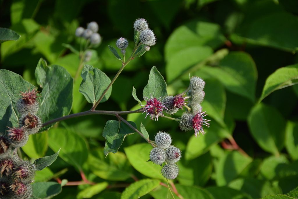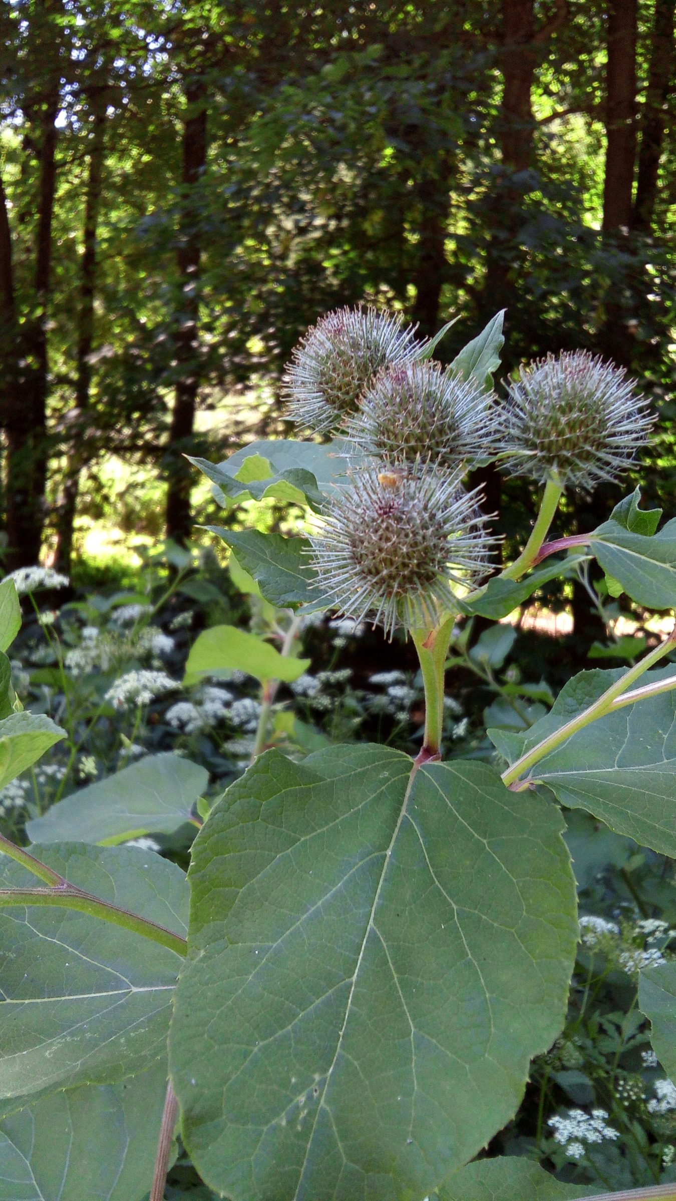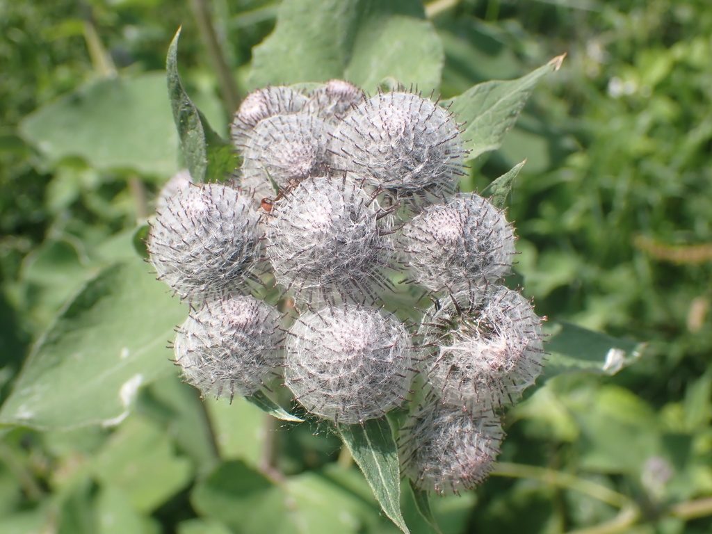- Как узнать: крупные листья с сероватым войлочным низом и цепкие корзинки.
