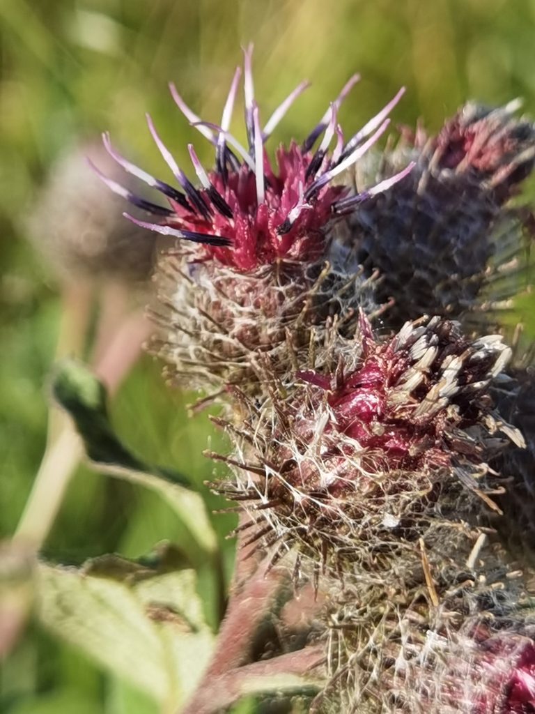 Соцветия — шаровидные корзинки с крючковатыми листочками обёртки. При созревании они легко цепляются за одежду и шерсть животных. Цветки обычно пурпурно‑розовые, плод — семянка.
