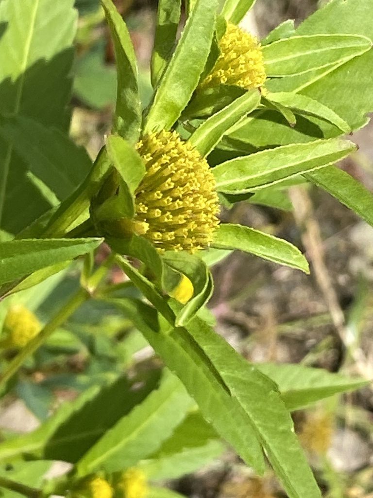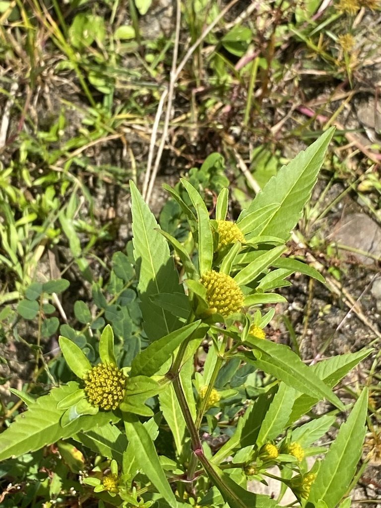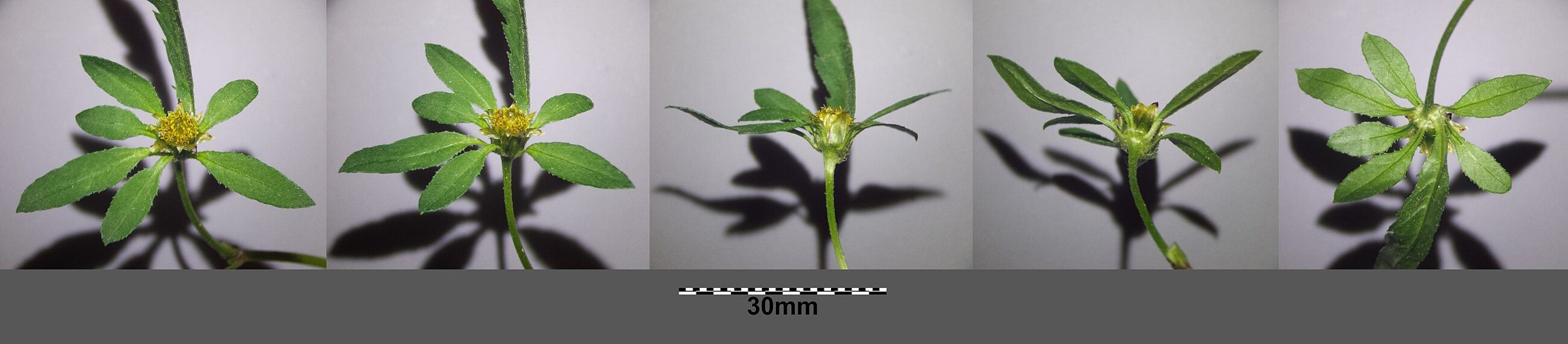 Корзинки небольшие и обычно без белых «лепестков», выглядят как компактные жёлтые пуговки. Самый узнаваемый признак — плоды с двумя остями, которые цепляются за ткань и шерсть.