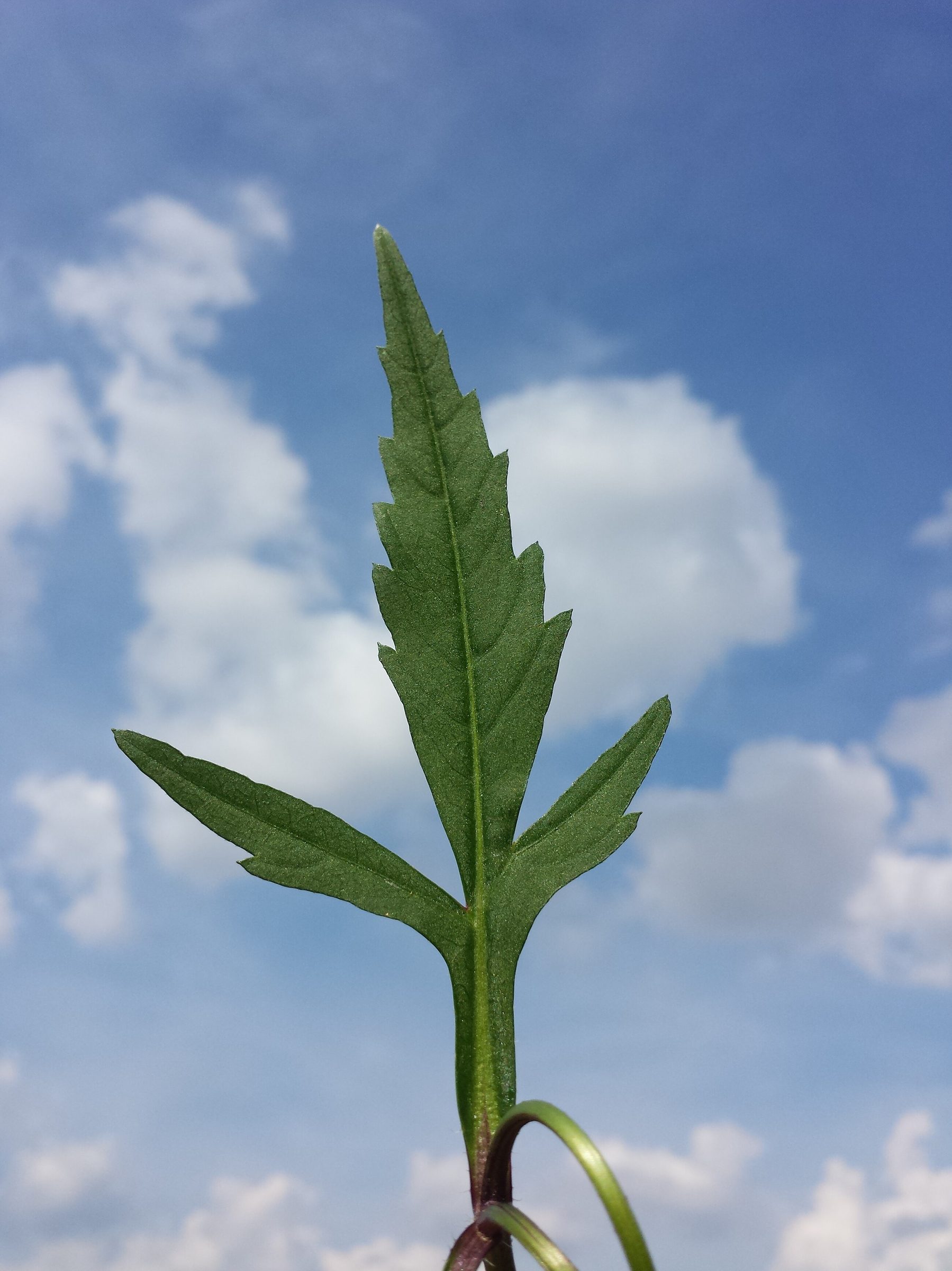 Листья супротивные, на черешках, часто трёхраздельные или глубоко лопастные, с зубчатым краем. Верхние листья могут быть менее рассечёнными, но характер «трёх долей» у вида заметен на большинстве побегов.