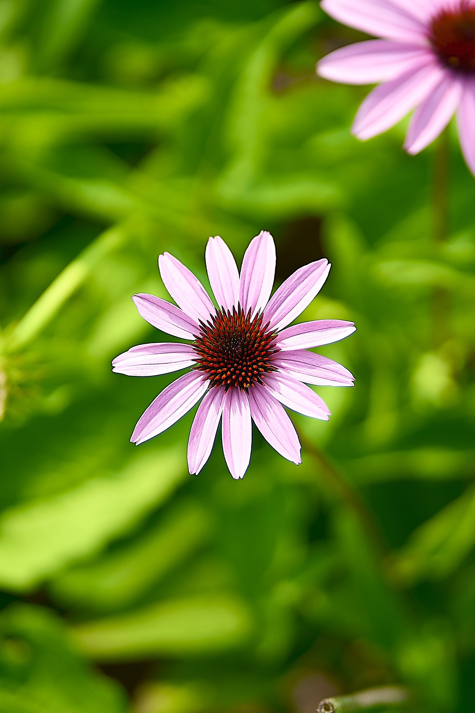 Эхинацея пурпурная — травянистое многолетнее растение с прямыми, жёсткими, немного шероховатыми стеблями. В зависимости от условий обычно достигает 60–120 см высоты.
