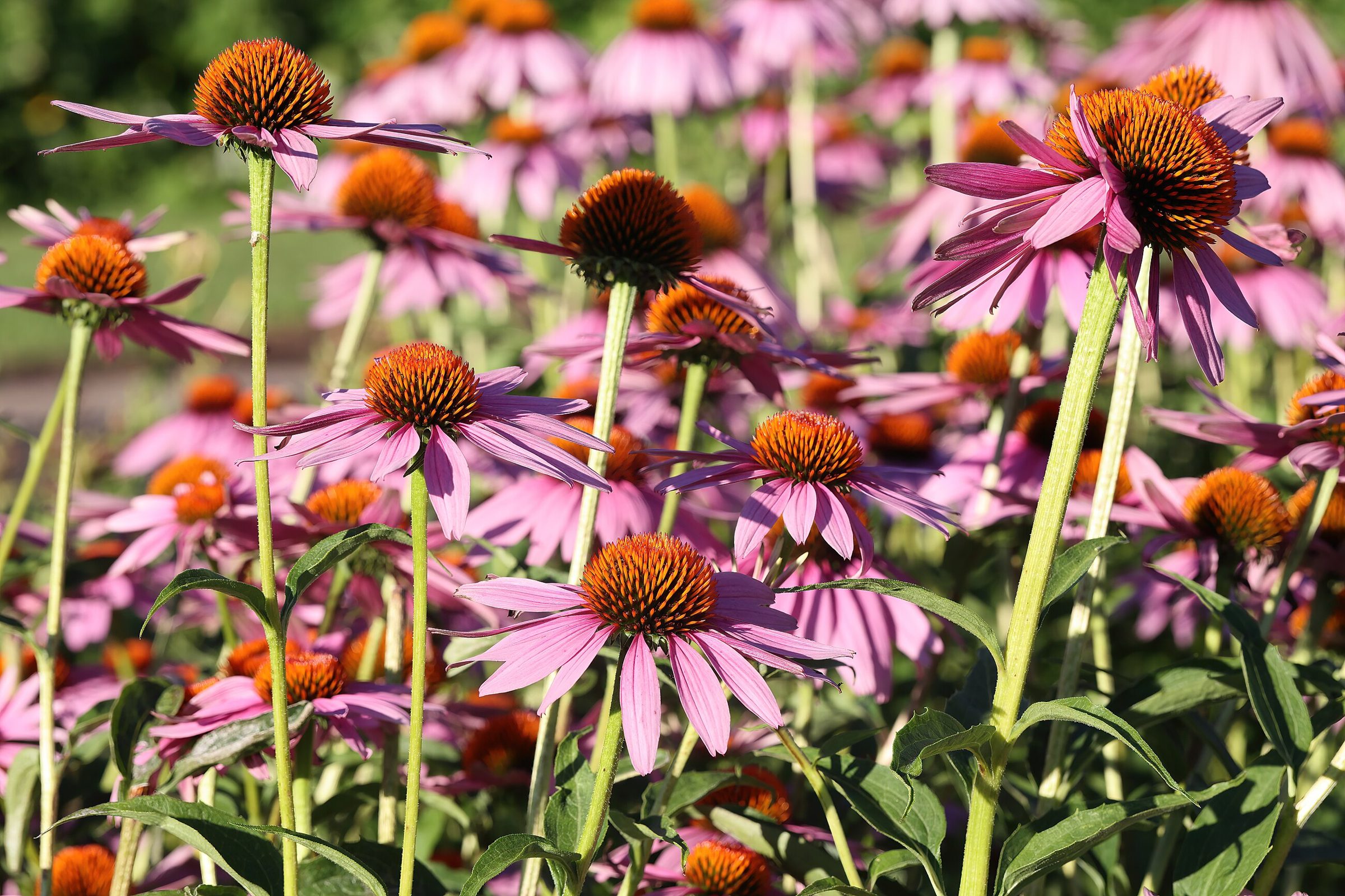 - Эхинацея бледная (Echinacea pallida) — лепестки заметно длиннее и более узкие, чаще сильнее «свисают», а общий тон цветков светлее.