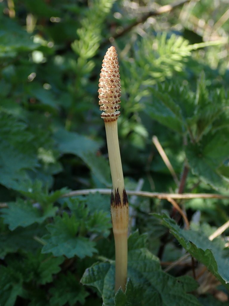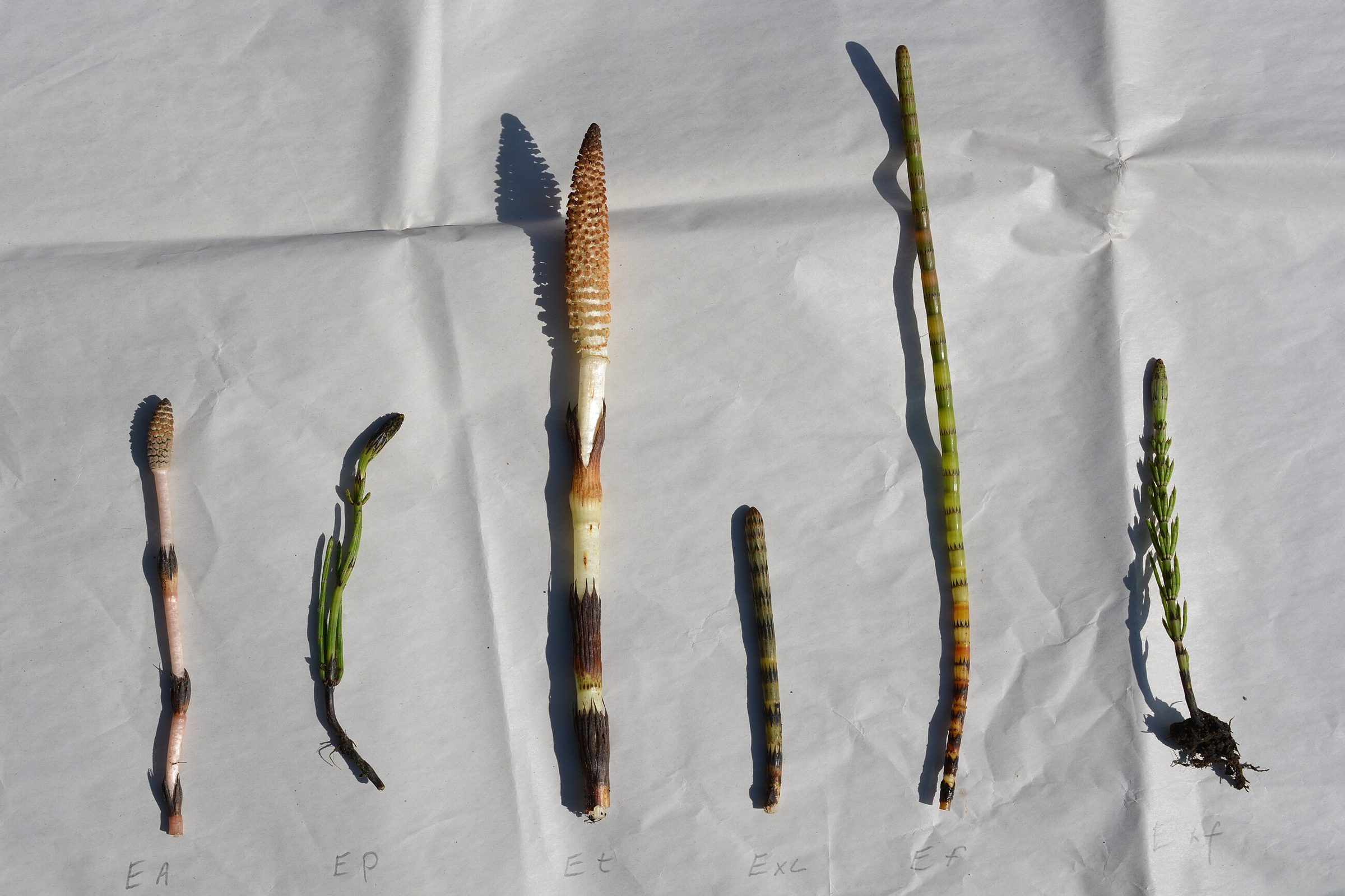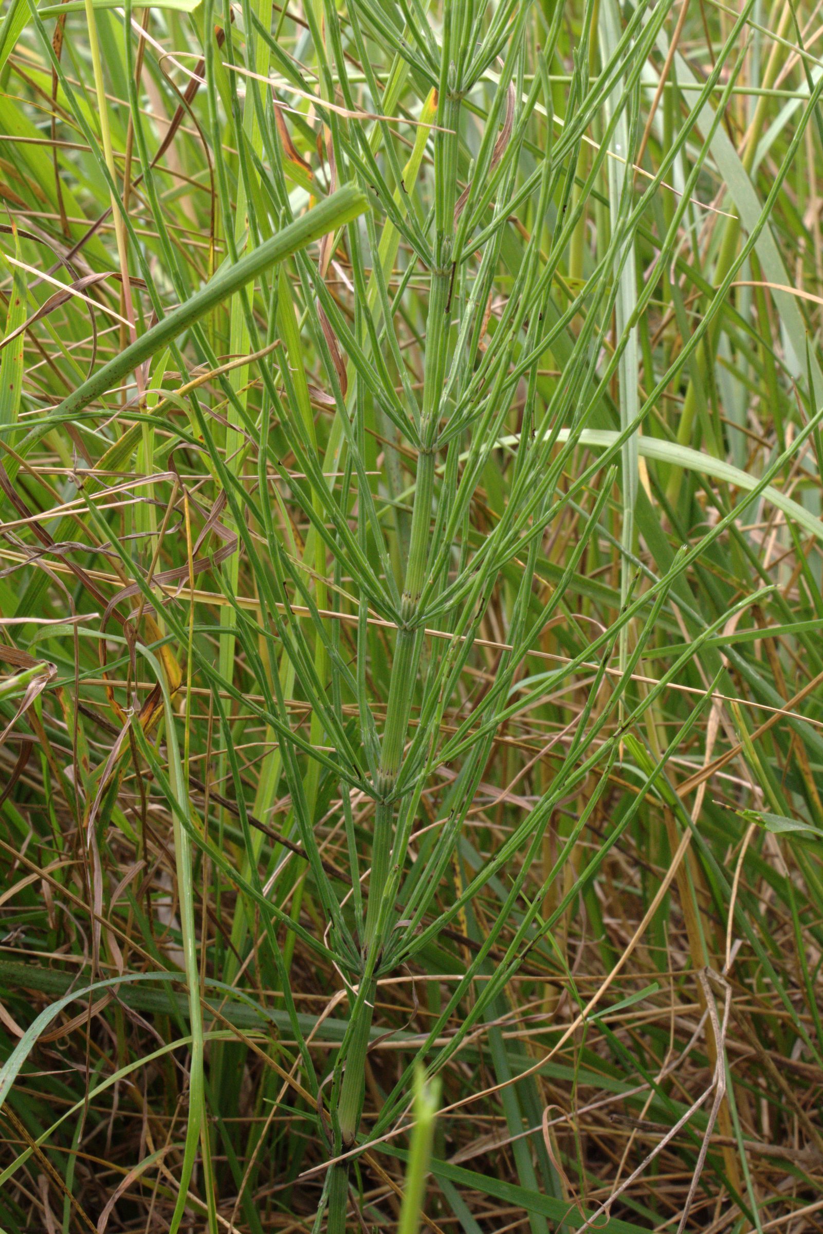 - Хвощ зимующий (Equisetum hyemale) — почти без боковых веточек, стебли прямые и жесткие, с заметными темными полосками на влагалищах.