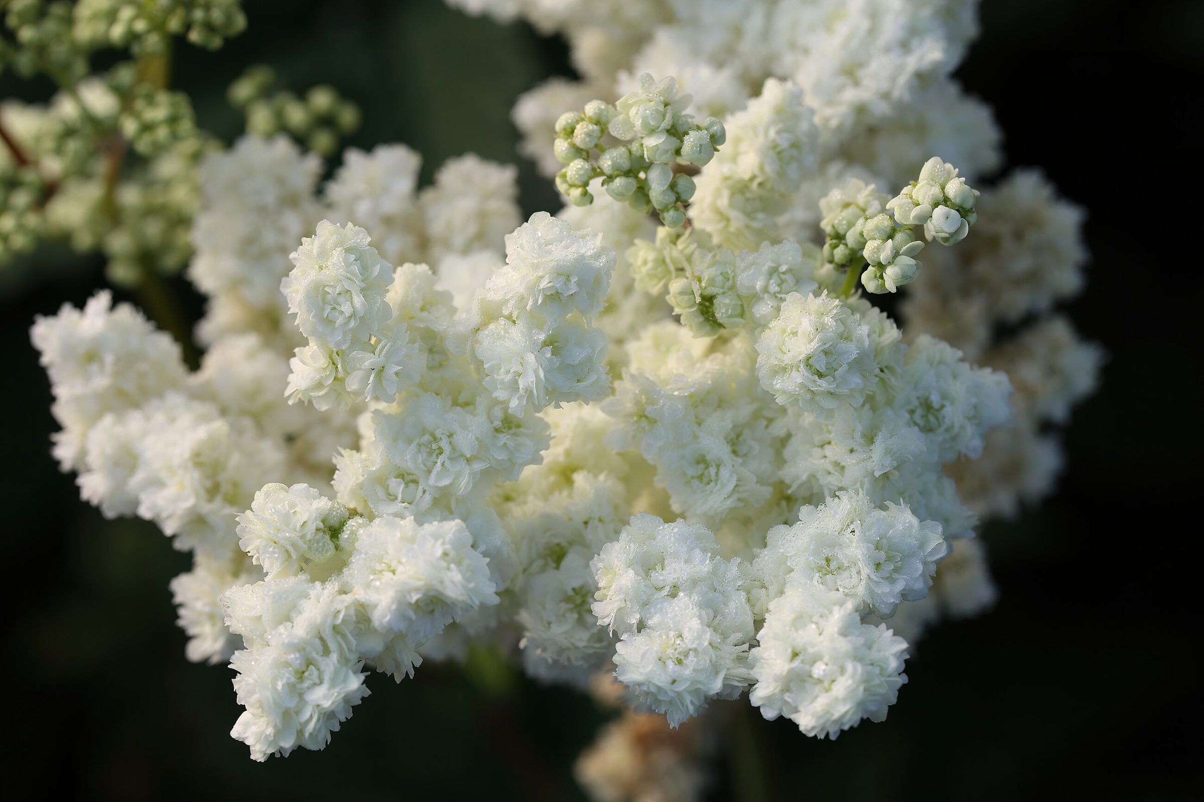 Соцветия — крупные рыхлые метёлки из множества мелких кремово-белых цветков. Во время цветения растение хорошо узнаётся по «пушистому» облаку цветов и выраженному сладковатому, местами салицилатному аромату.