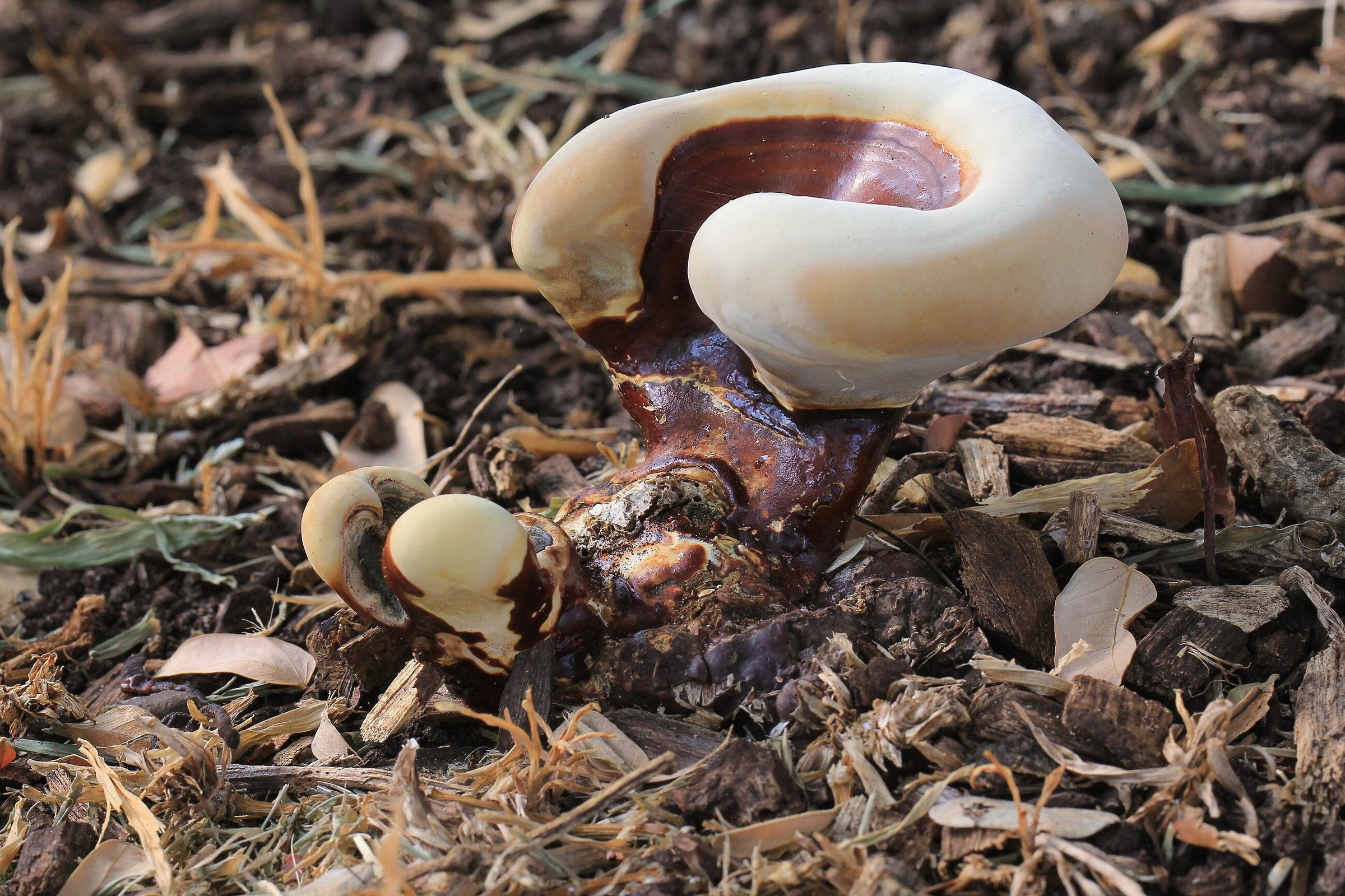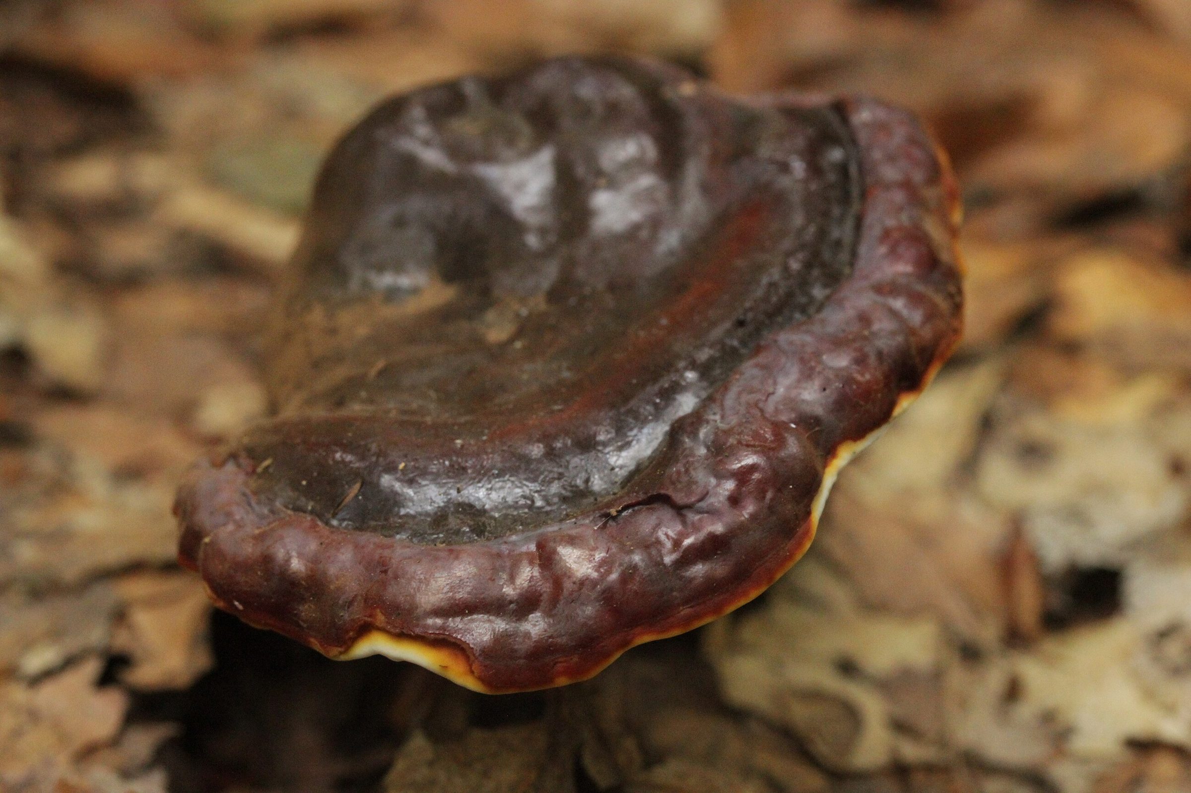 Самая заметная особенность рейши — выраженный “лакированный” блеск верхней поверхности и красно-бурые концентрические зоны. Край шляпки часто волнистый, а ножка, если есть, обычно боковая.
