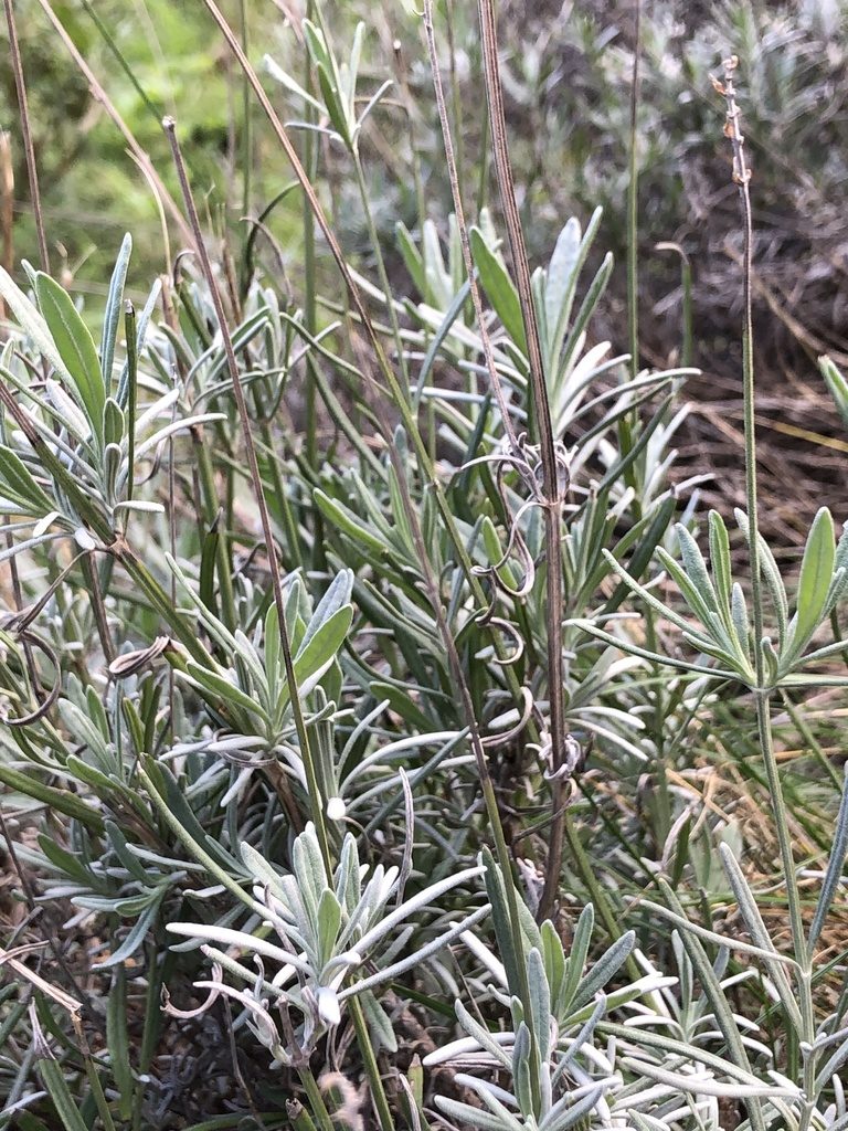 Листья супротивные, узкие, линейно-ланцетные, серовато-зелёные, часто слегка опушённые, из-за чего растение выглядит «припылённым». На ощупь листва плотная и суховатая, с выраженным запахом при растирании.