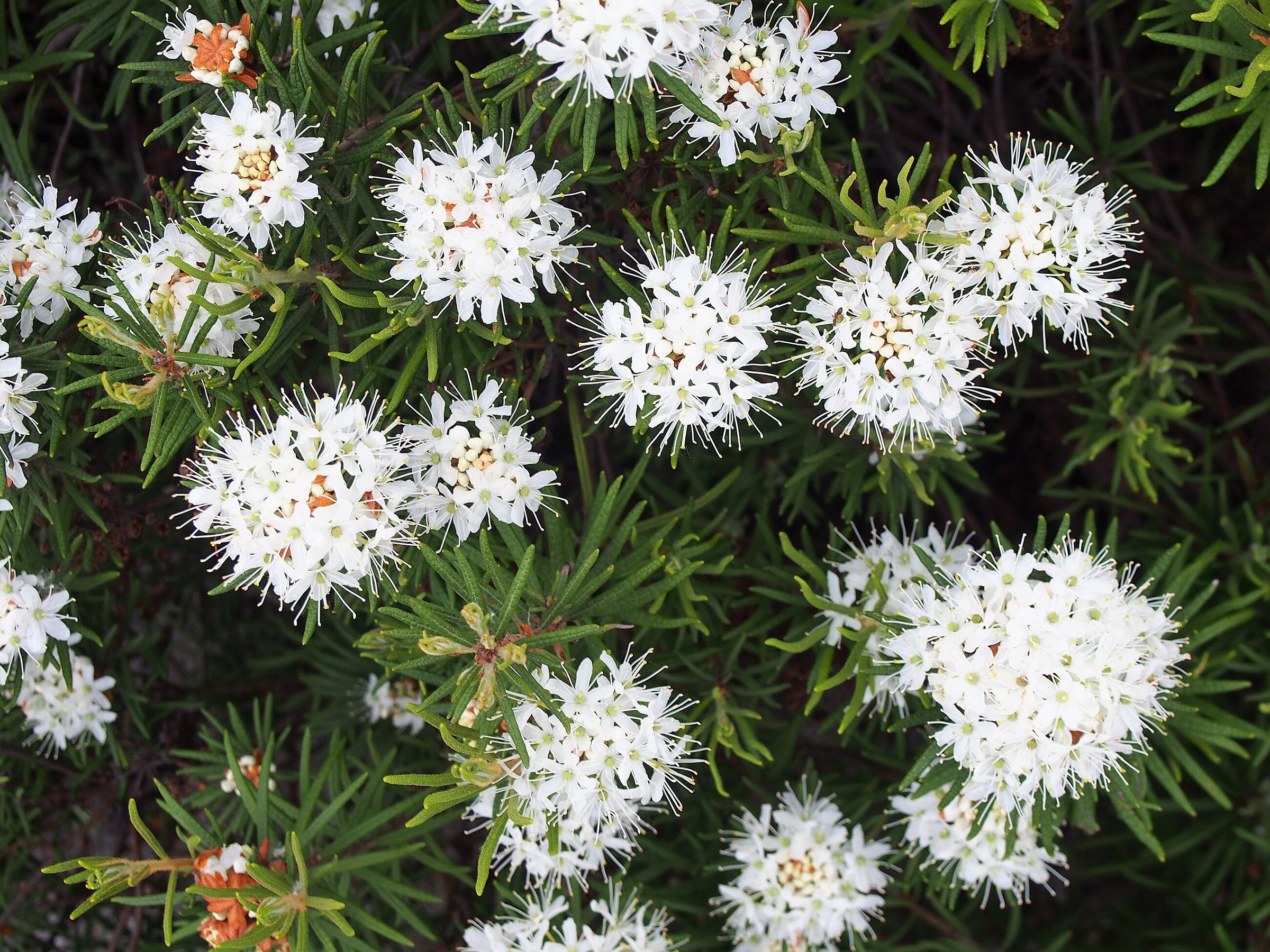 При растирании побегов и листьев появляется резкий смолисто-камфорный запах. Цветки белые и собраны плотными пучками на концах веточек, издалека растение выглядит как светлая «шапка» на фоне мха.