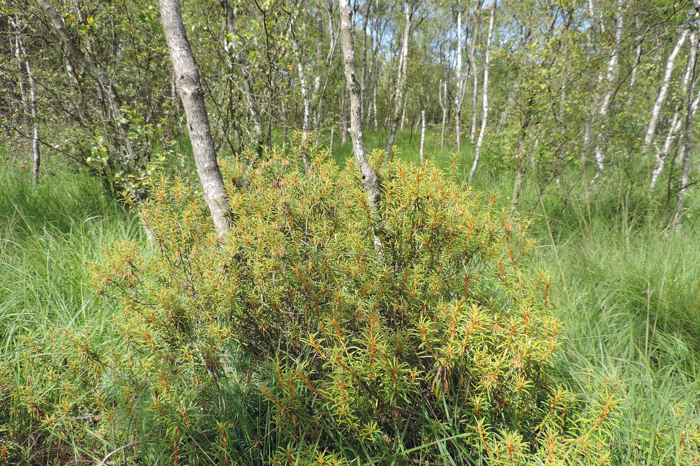 Багульник болотный — вечнозелёный кустарничек из семейства вересковых, обычно высотой от нескольких десятков сантиметров до метра и более. Побеги тонкие, у молодых веточек заметно рыжеватое опушение.