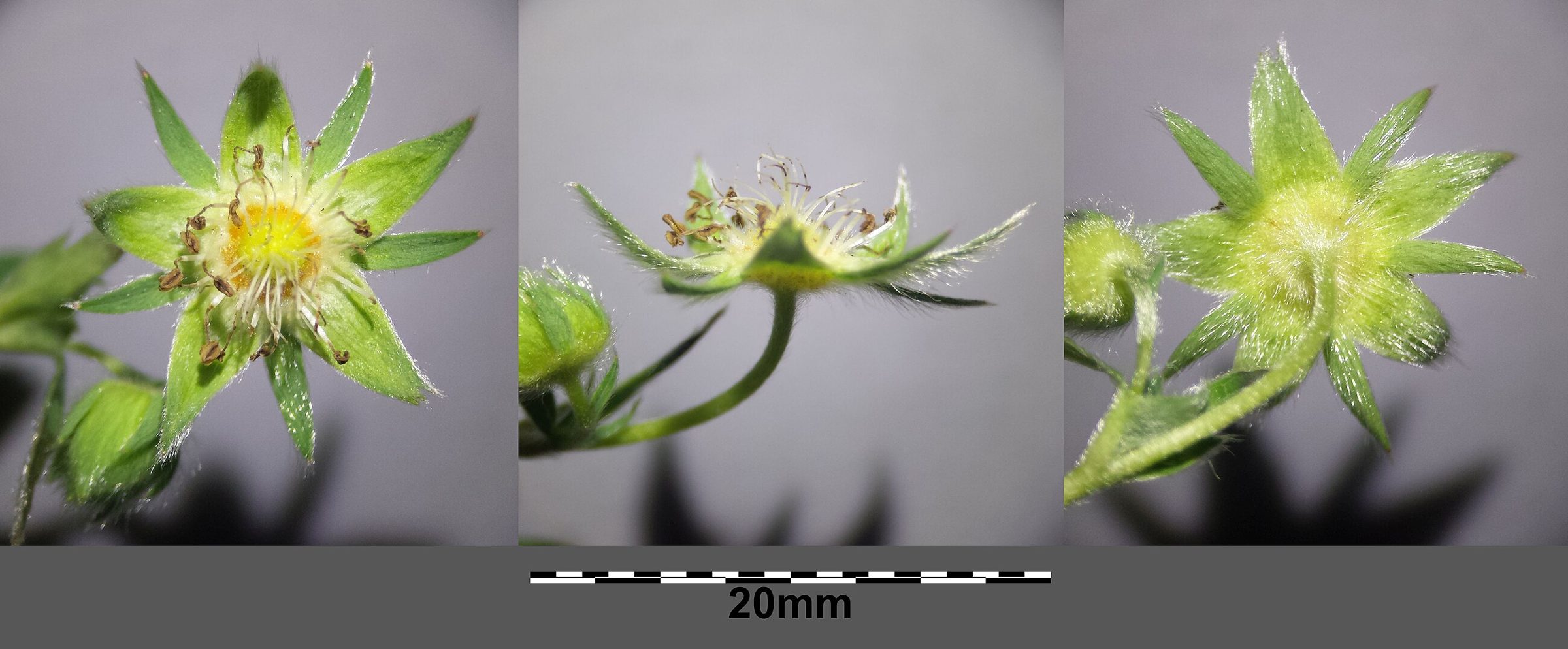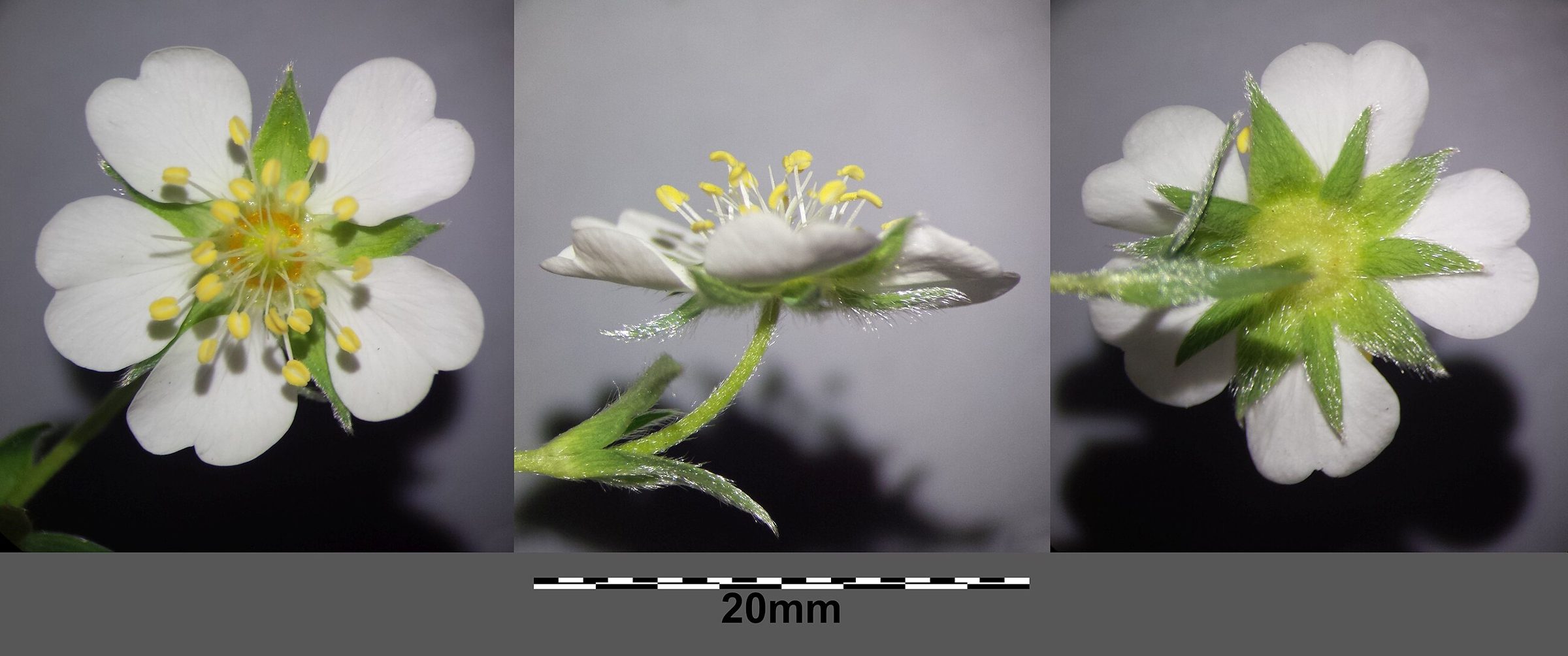 Цветки одиночные или в небольших группах, с пятью белыми лепестками, что отличает вид от многих других лапчаток с жёлтым цветением. После цветения формируются мелкие сухие плоды-семянки.