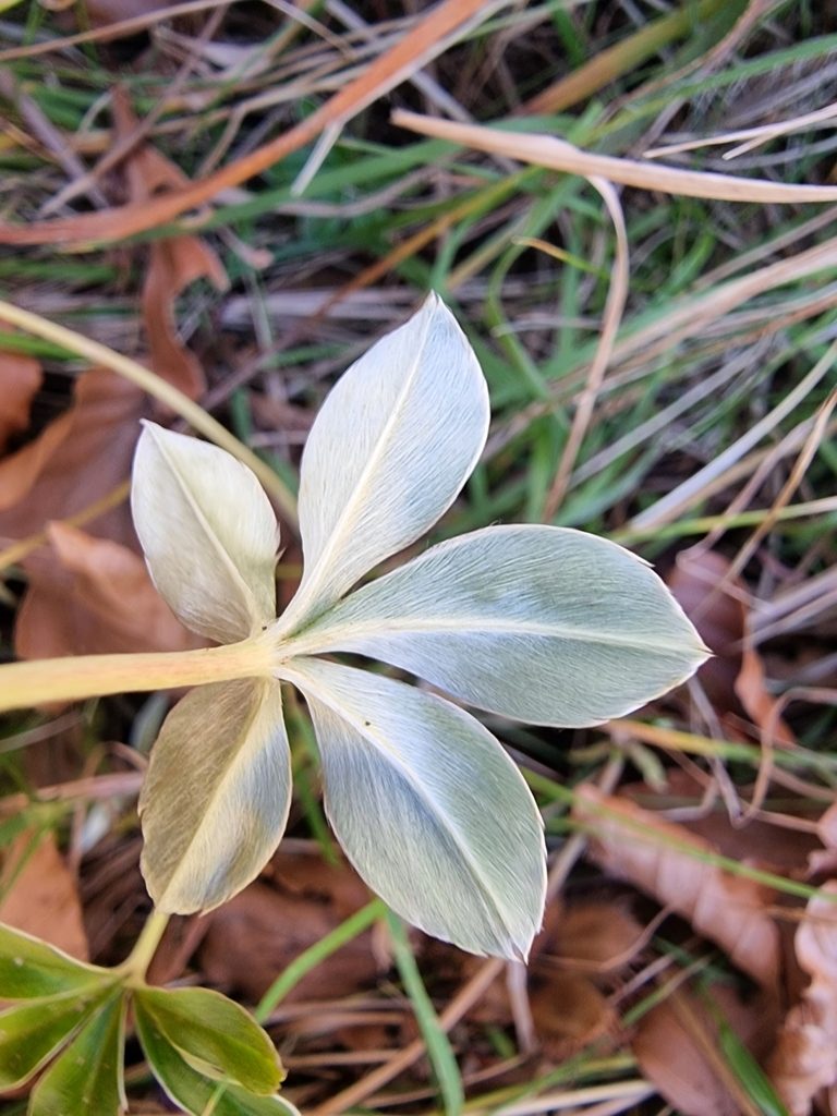 Основная масса листьев собрана у основания. Листья пальчатые, чаще из пяти листочков, на длинных черешках, снизу заметно шелковисто-опушённые, с лёгким серебристым оттенком.