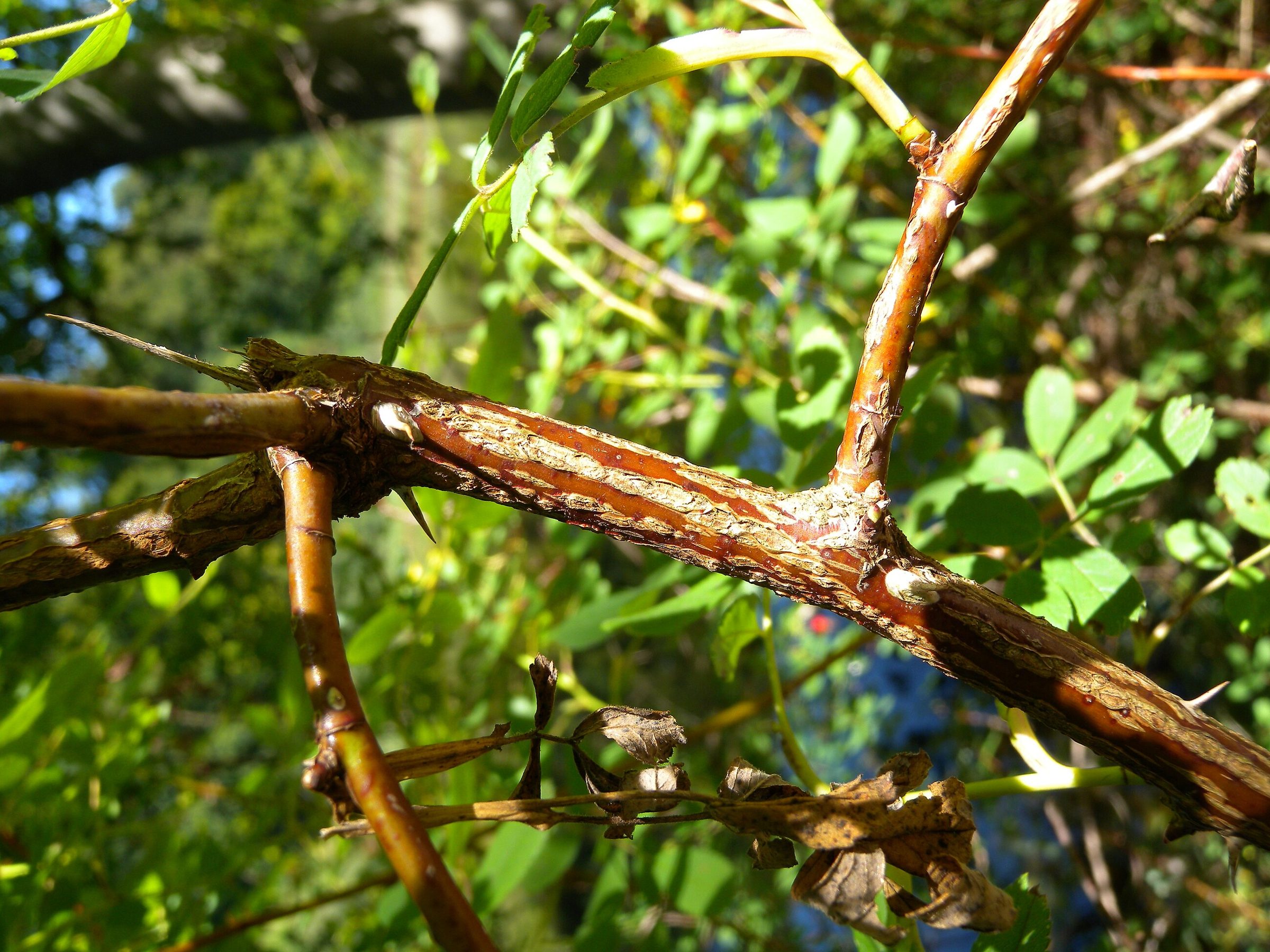 - Как узнать: оранжево красные плоды и парные изогнутые шипы на побегах.