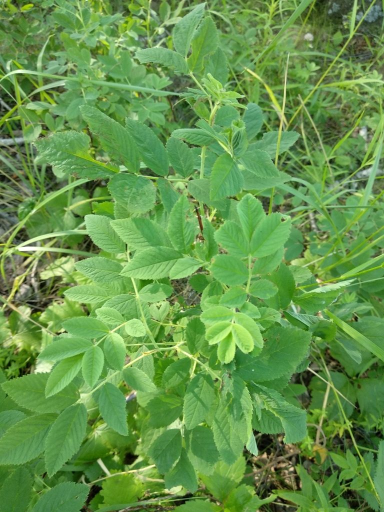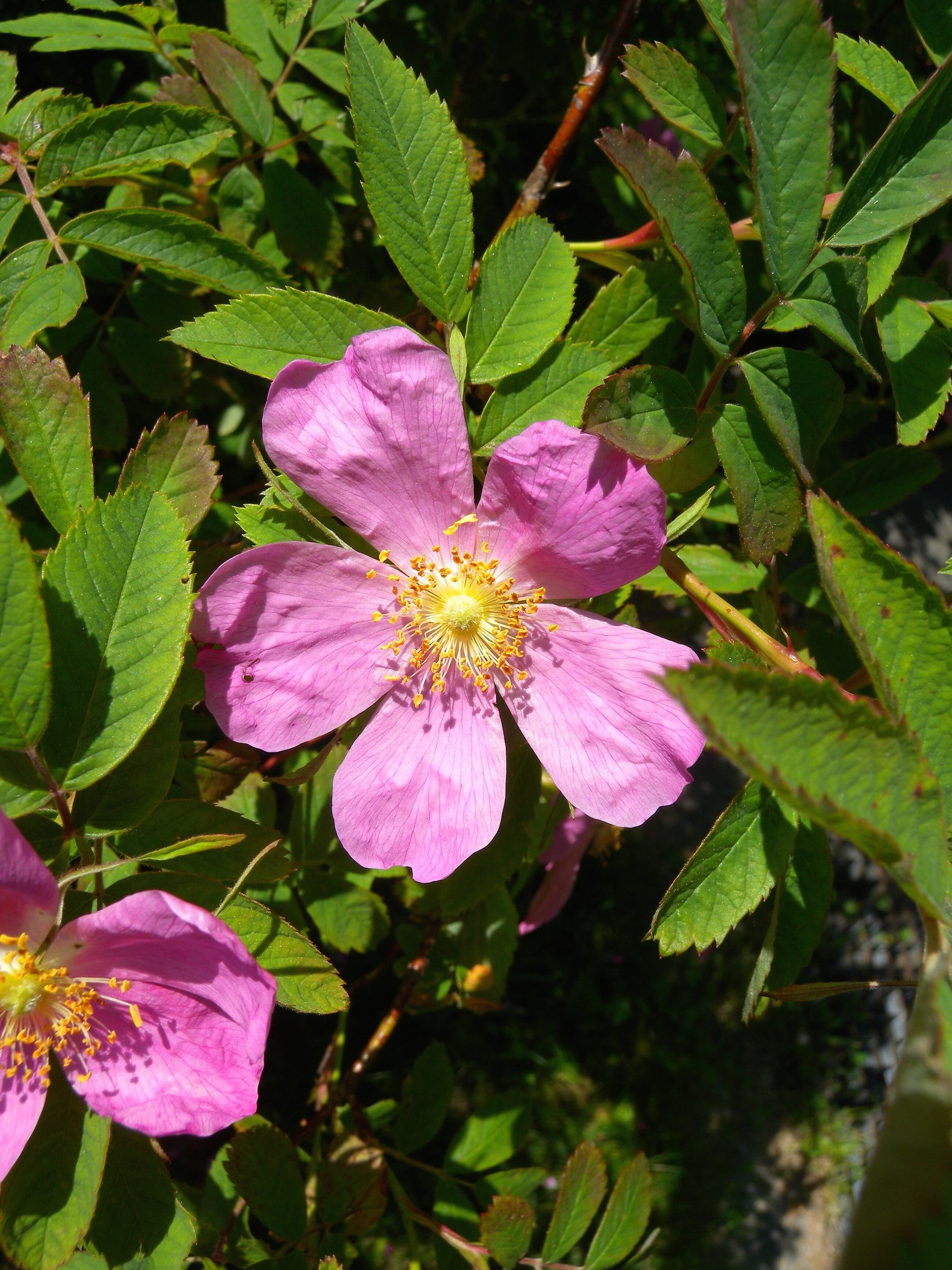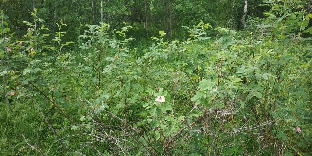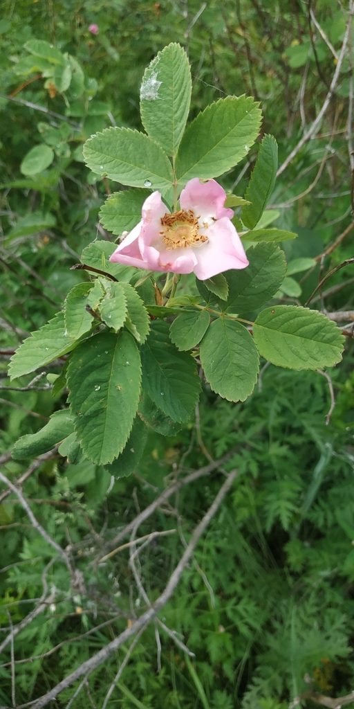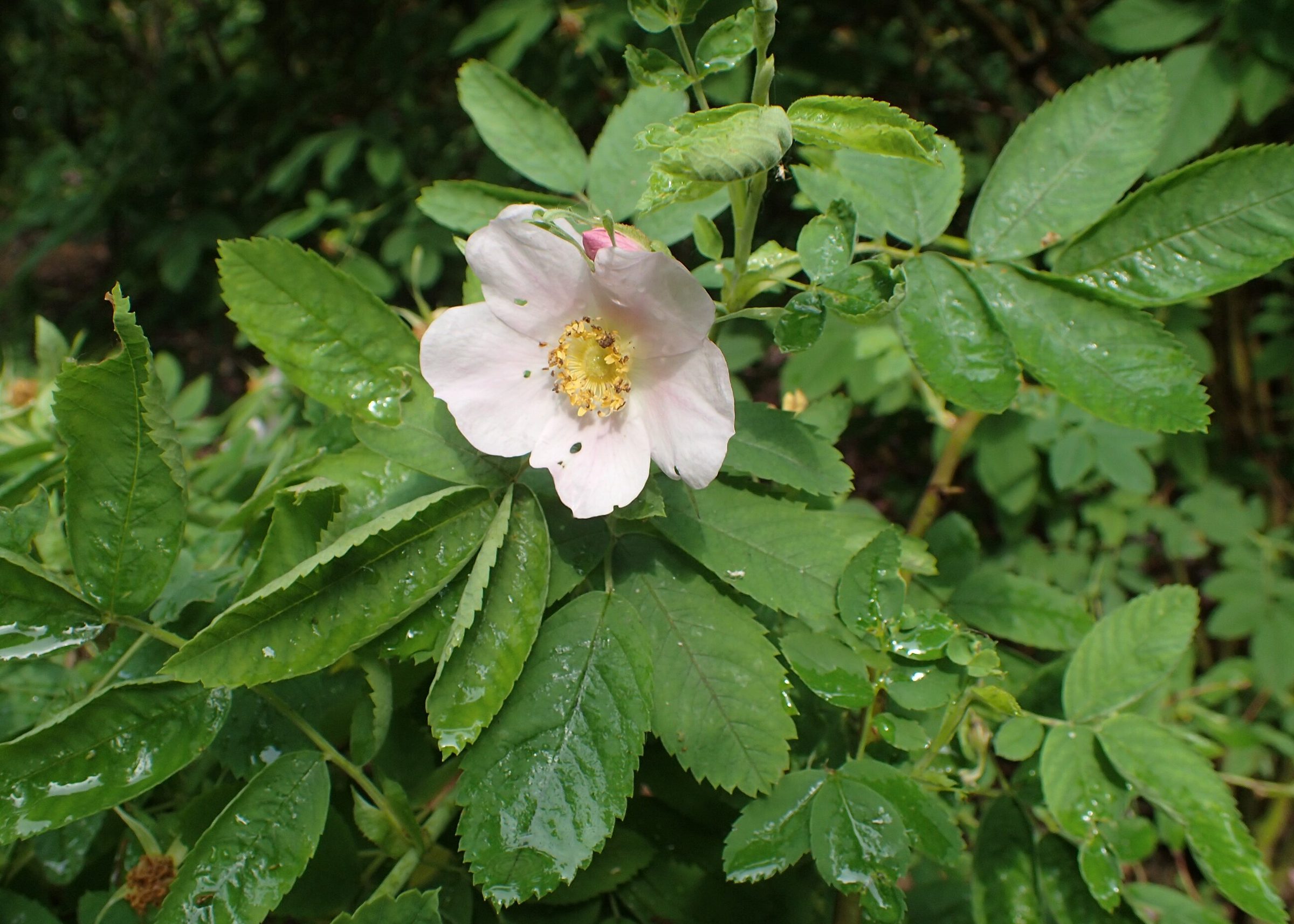 - Шиповник иглистый (Rosa acicularis) — на побегах заметно больше мелких «игольчатых» шипиков, а куст обычно выглядит более колючим.