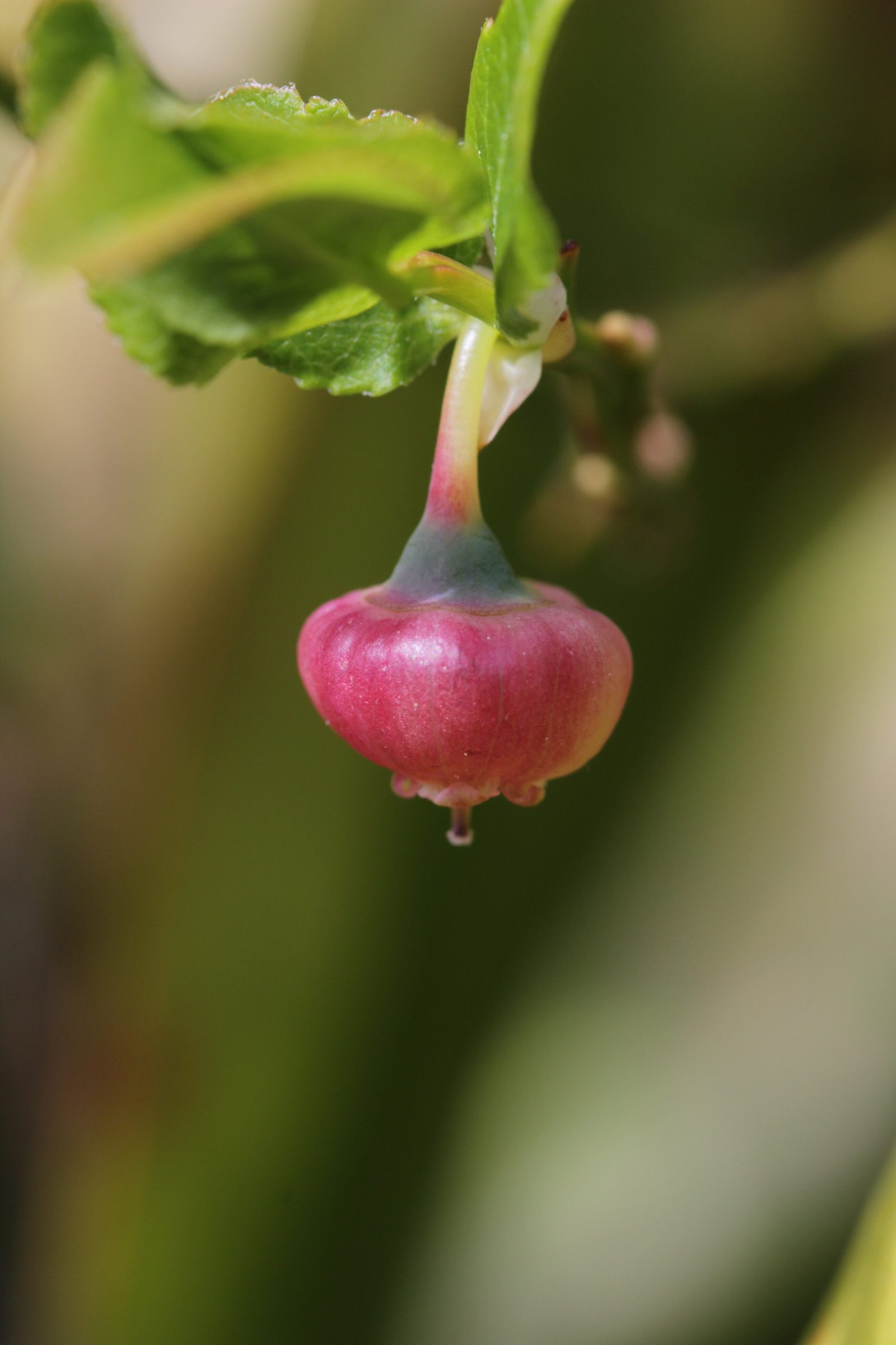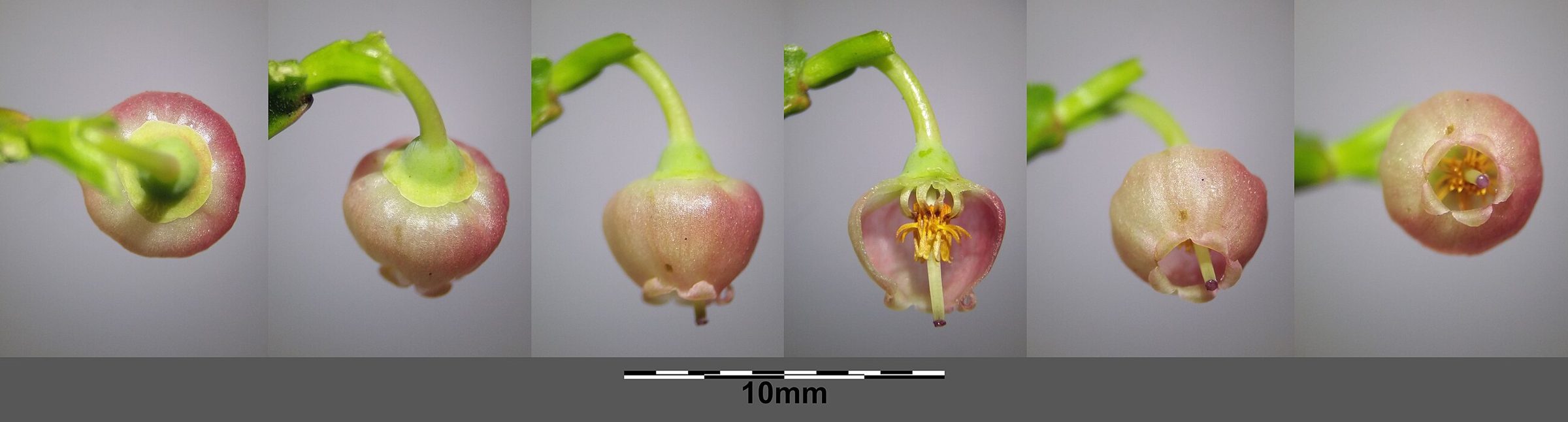 Цветки одиночные, поникающие, колокольчатые, розовато-зелёные. Плоды — шаровидные тёмно-синие ягоды с сизым налётом, окрашивающие соком.