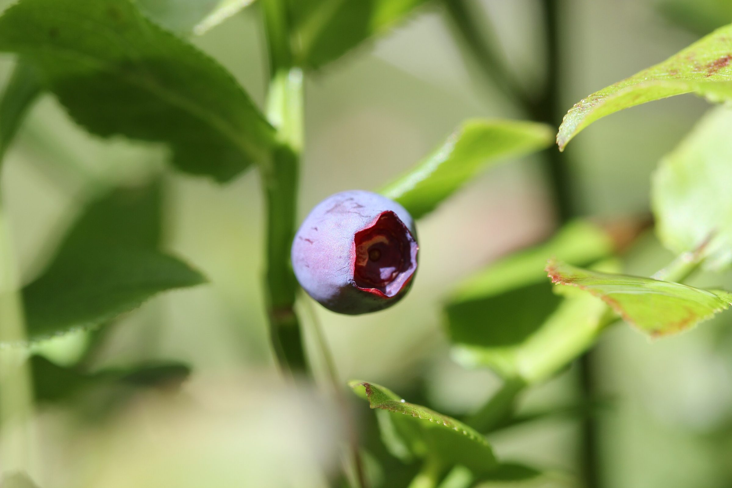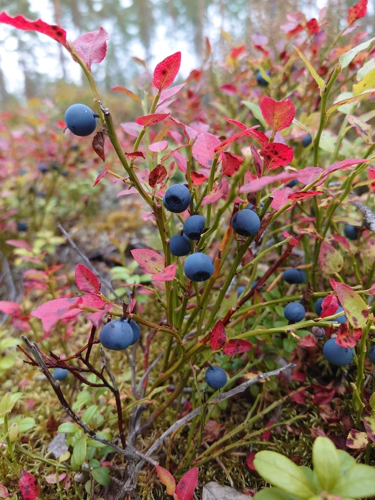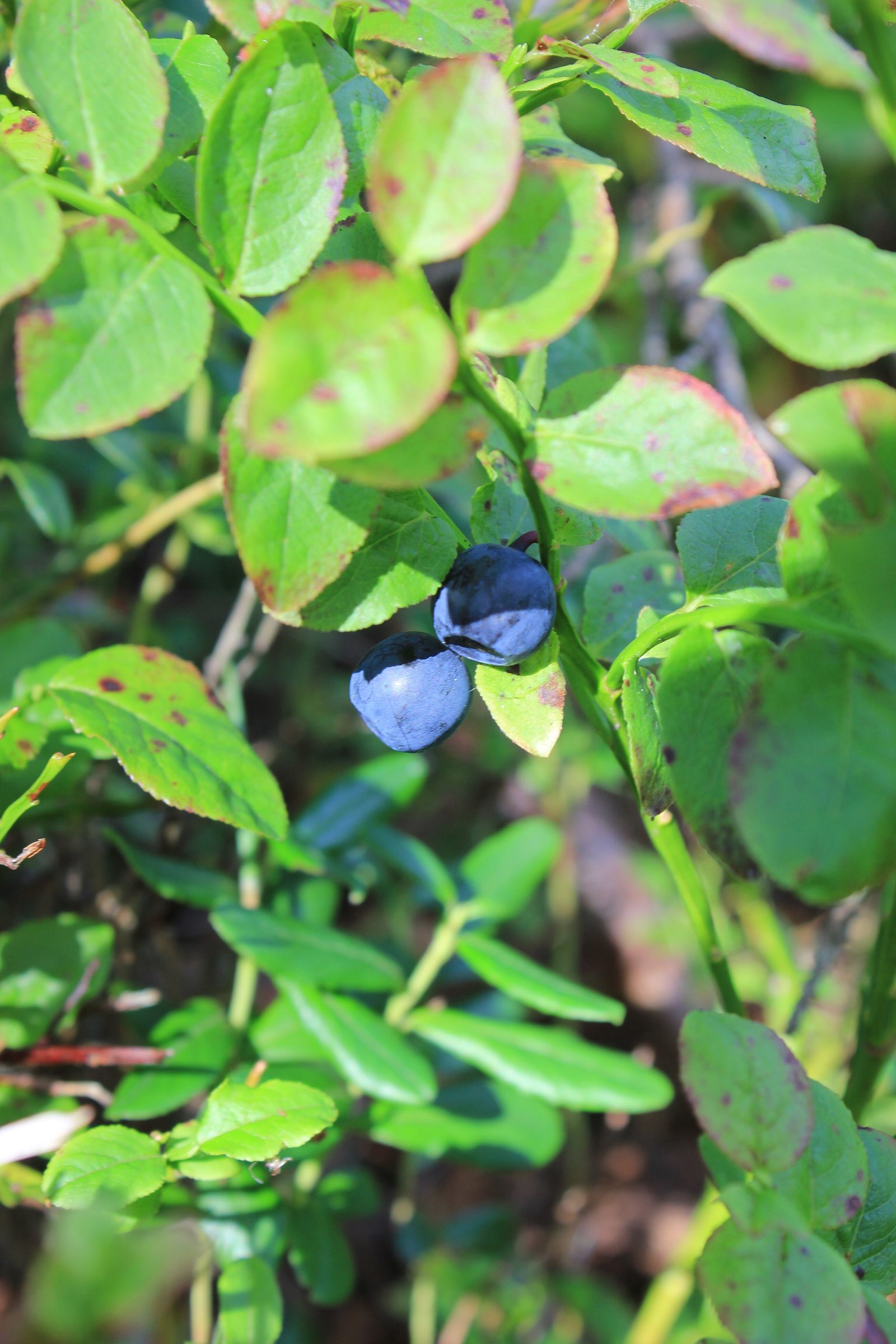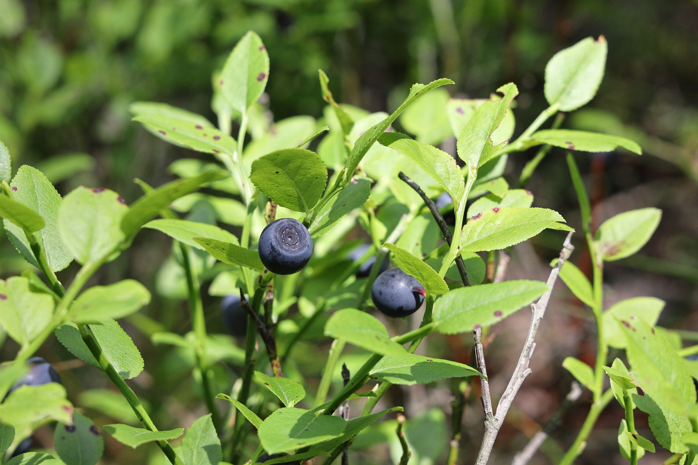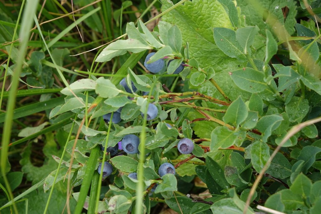 У черники тонкие зелёные побеги с заметными гранями, а листья небольшие, мягкие, с мелкими зубчиками по краю. На кустике ягоды обычно одиночные, тёмно-синие, с сизым налётом.
