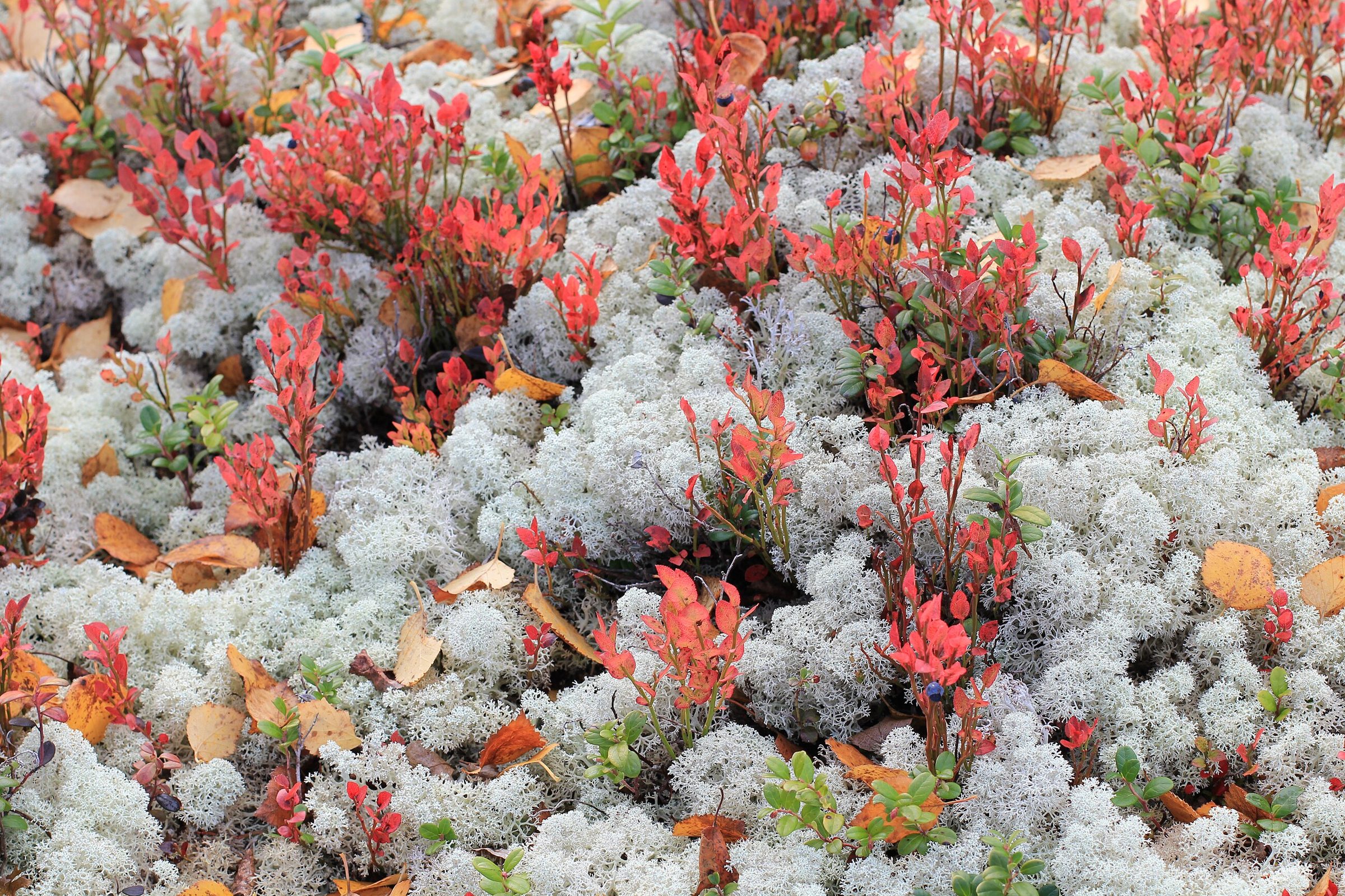- Брусника (Vaccinium vitis-idaea) — ягоды красные, листья кожистые и остаются зелёными зимой, снизу часто заметны точечки.