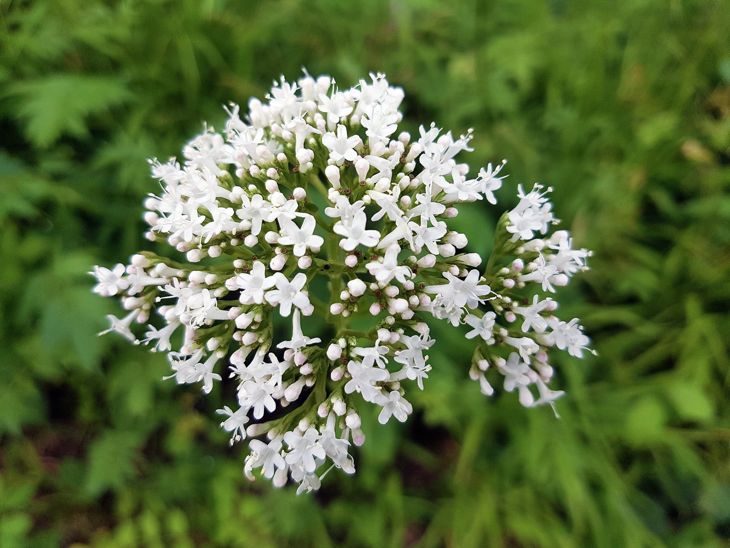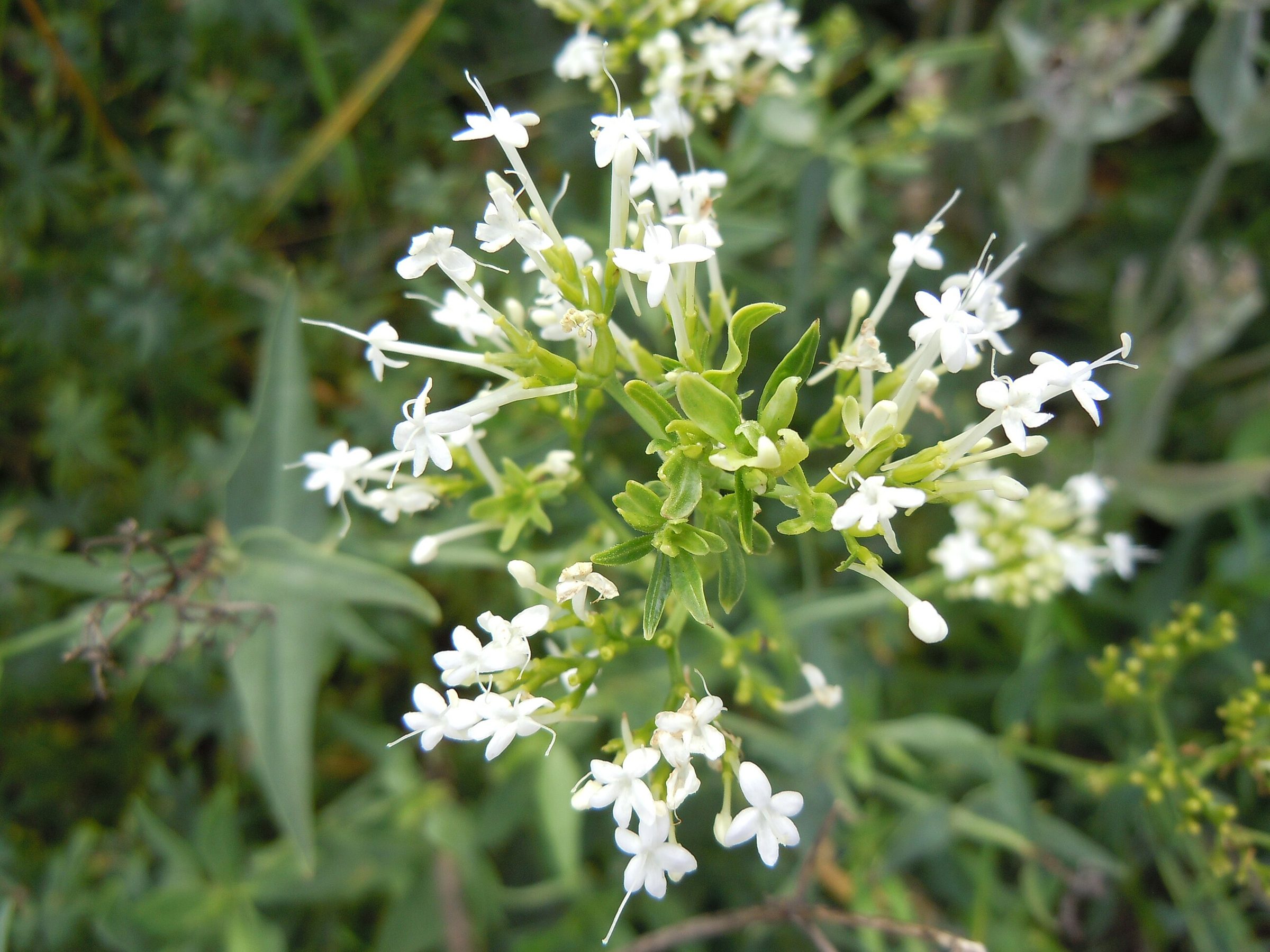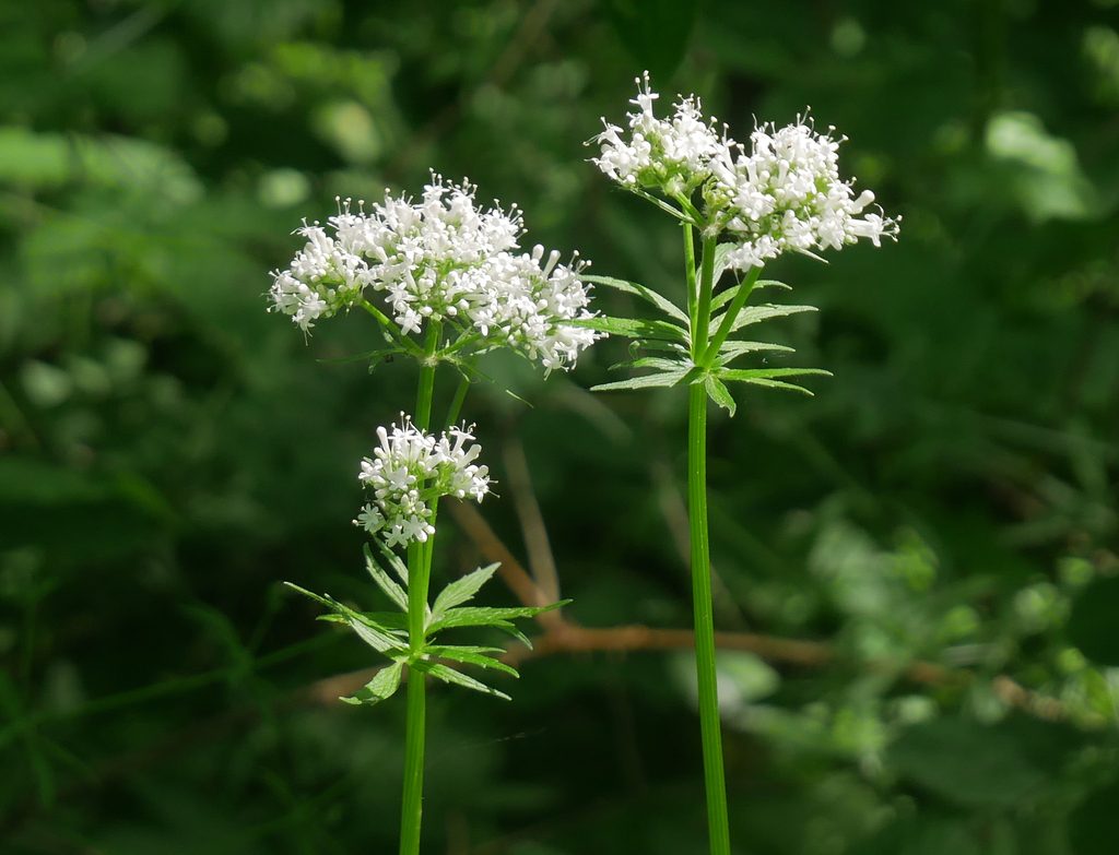 Для валерианы типичны прямой высокий стебель и супротивные перисто-раздельные листья с узкими долями. Соцветия выглядят как плотные розовато-белые «шапочки» на верхушках побегов.