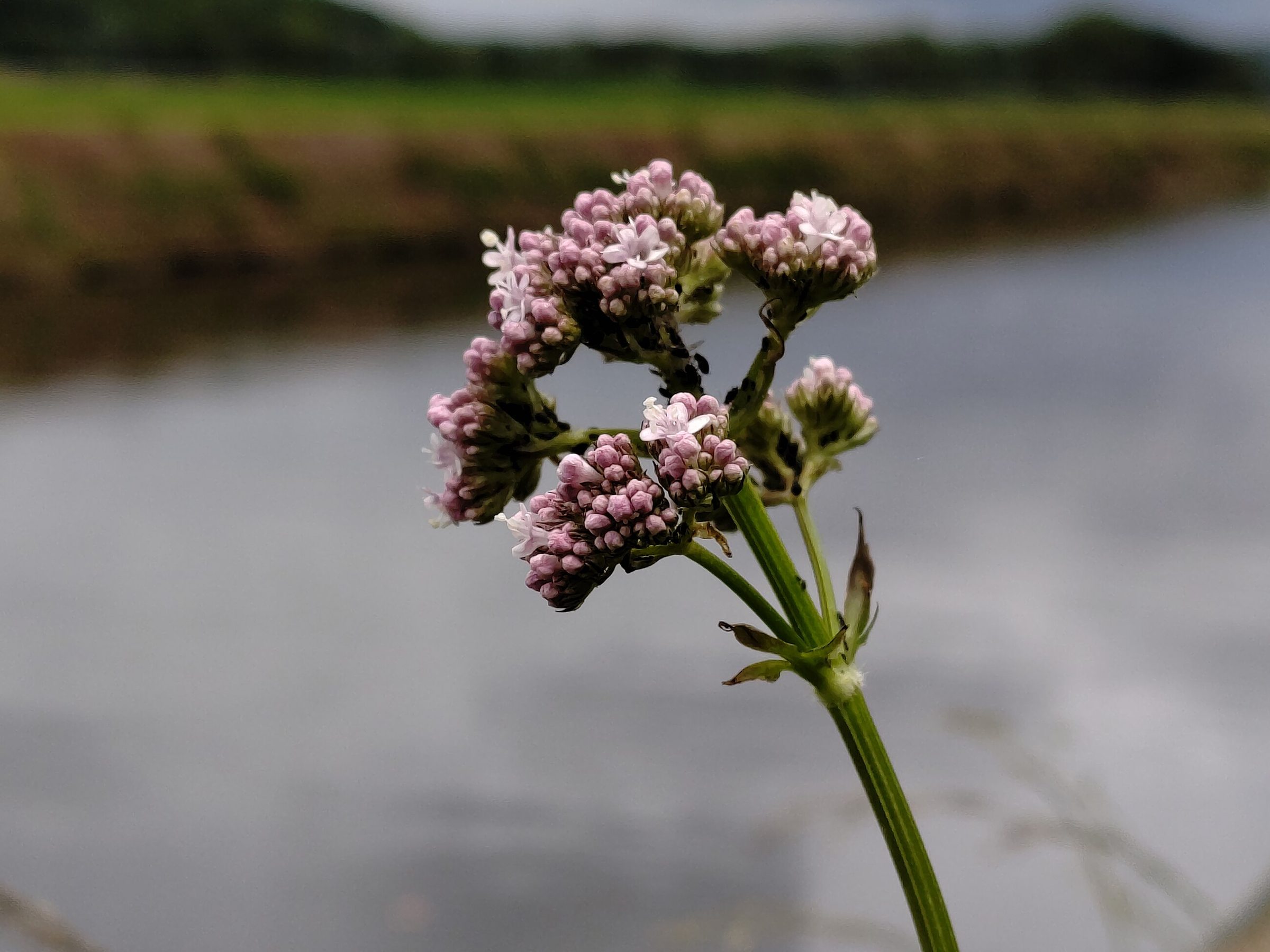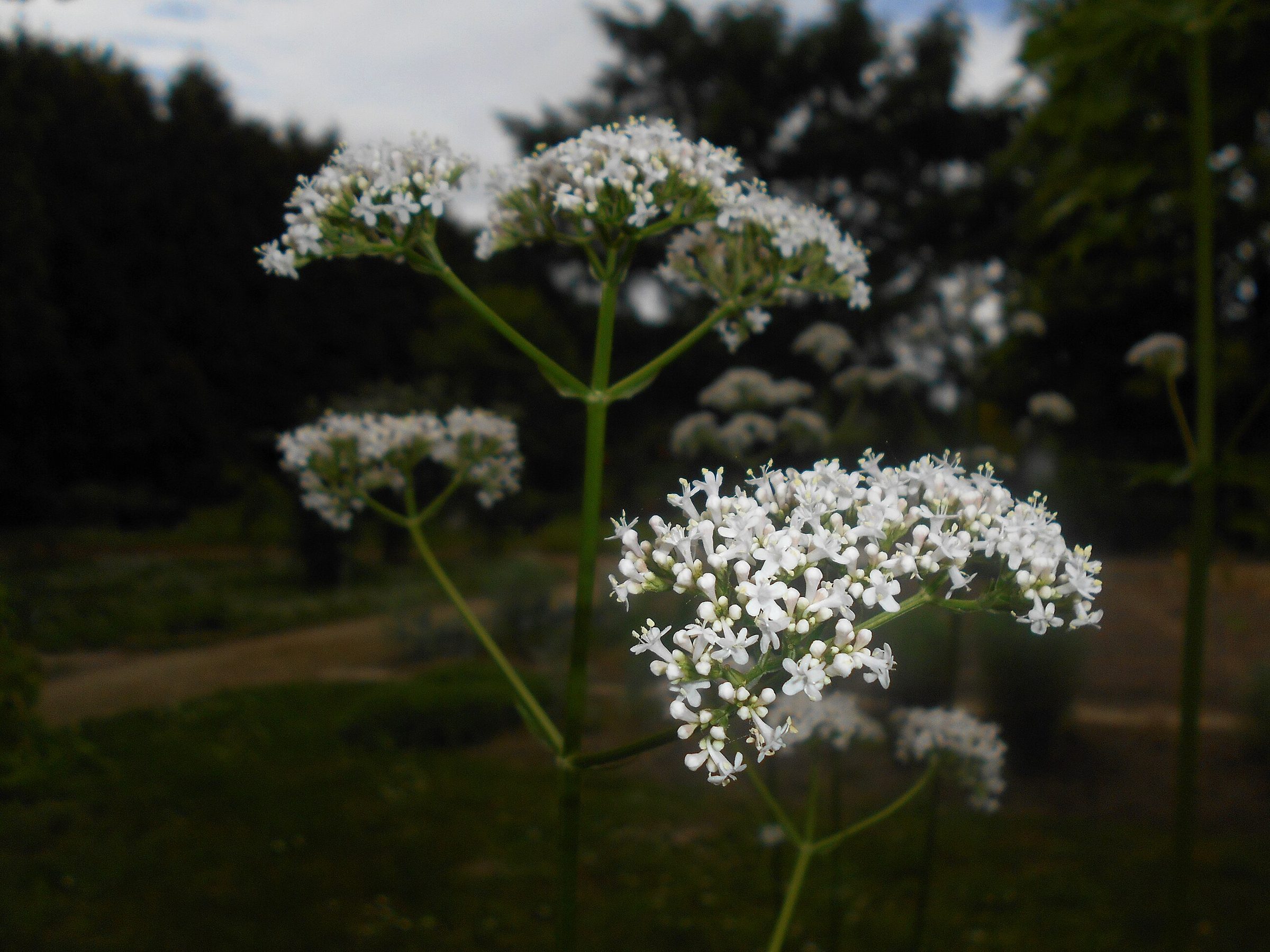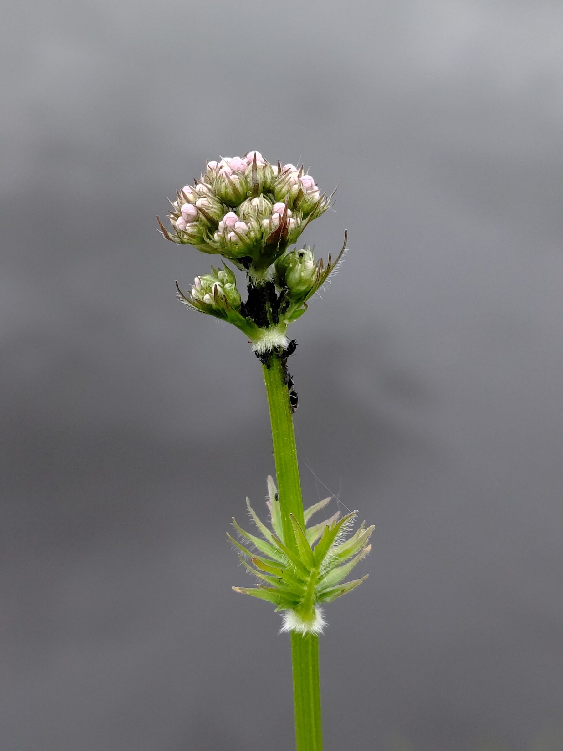 Для валерианы типичны прямой высокий стебель и супротивные перисто-раздельные листья с узкими долями. Соцветия выглядят как плотные розовато-белые «шапочки» на верхушках побегов.
