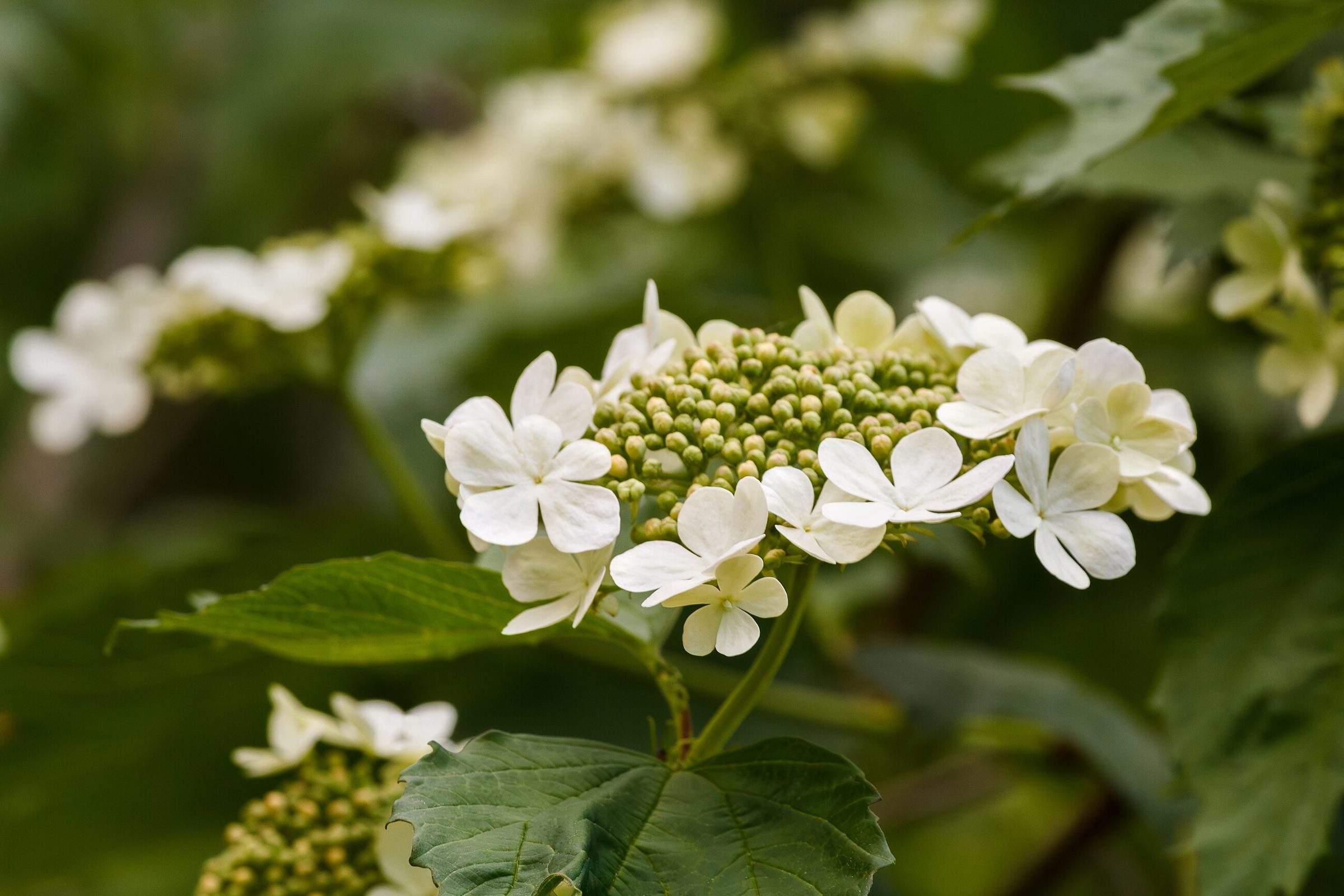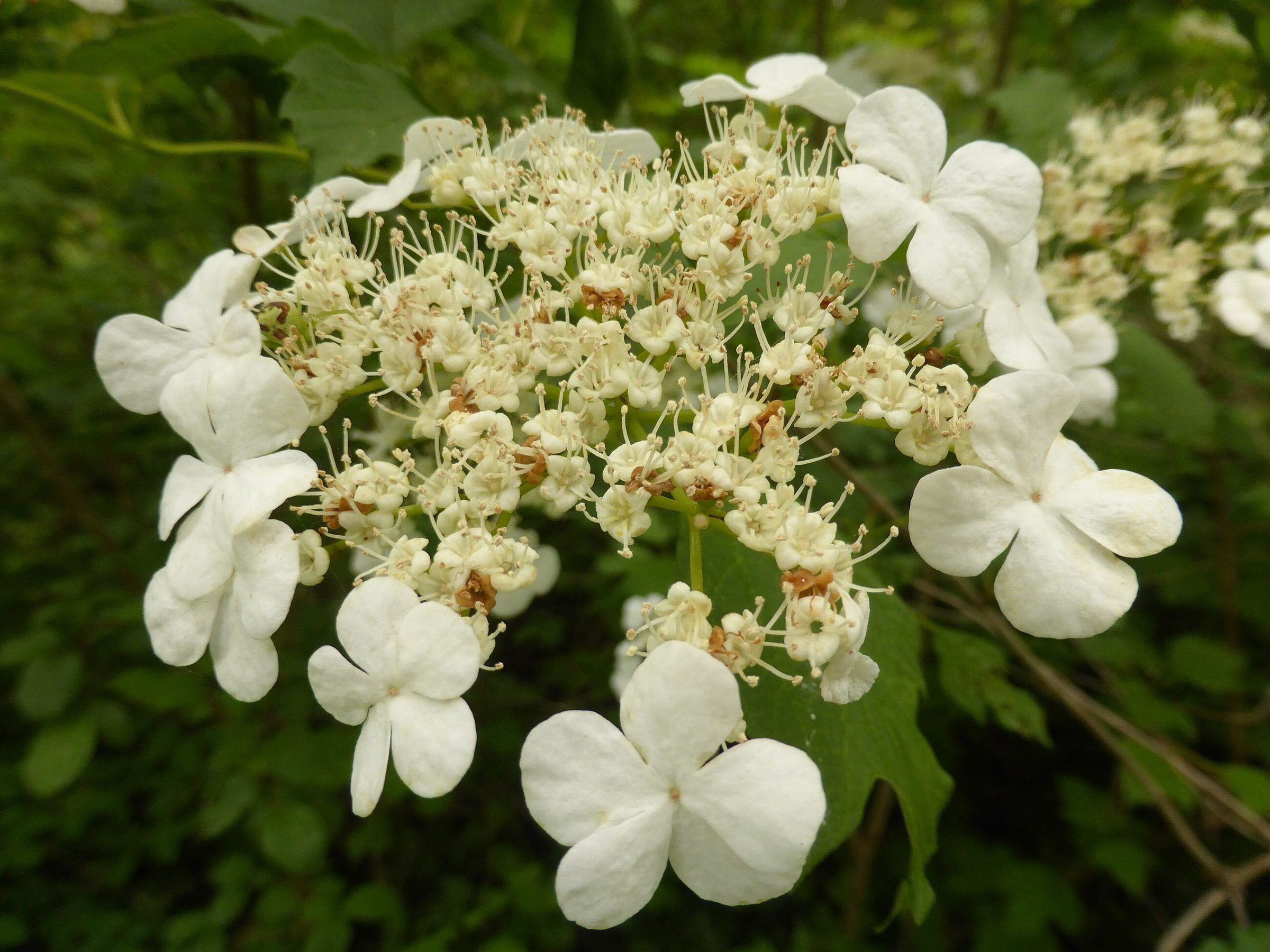 В поле калину проще всего узнать по супротивным трёхлопастным листьям с крупными зубчиками и по плоским белым соцветиям, у которых по краю заметны крупные стерильные цветки. Такой «ободок» хорошо виден издалека в период цветения.