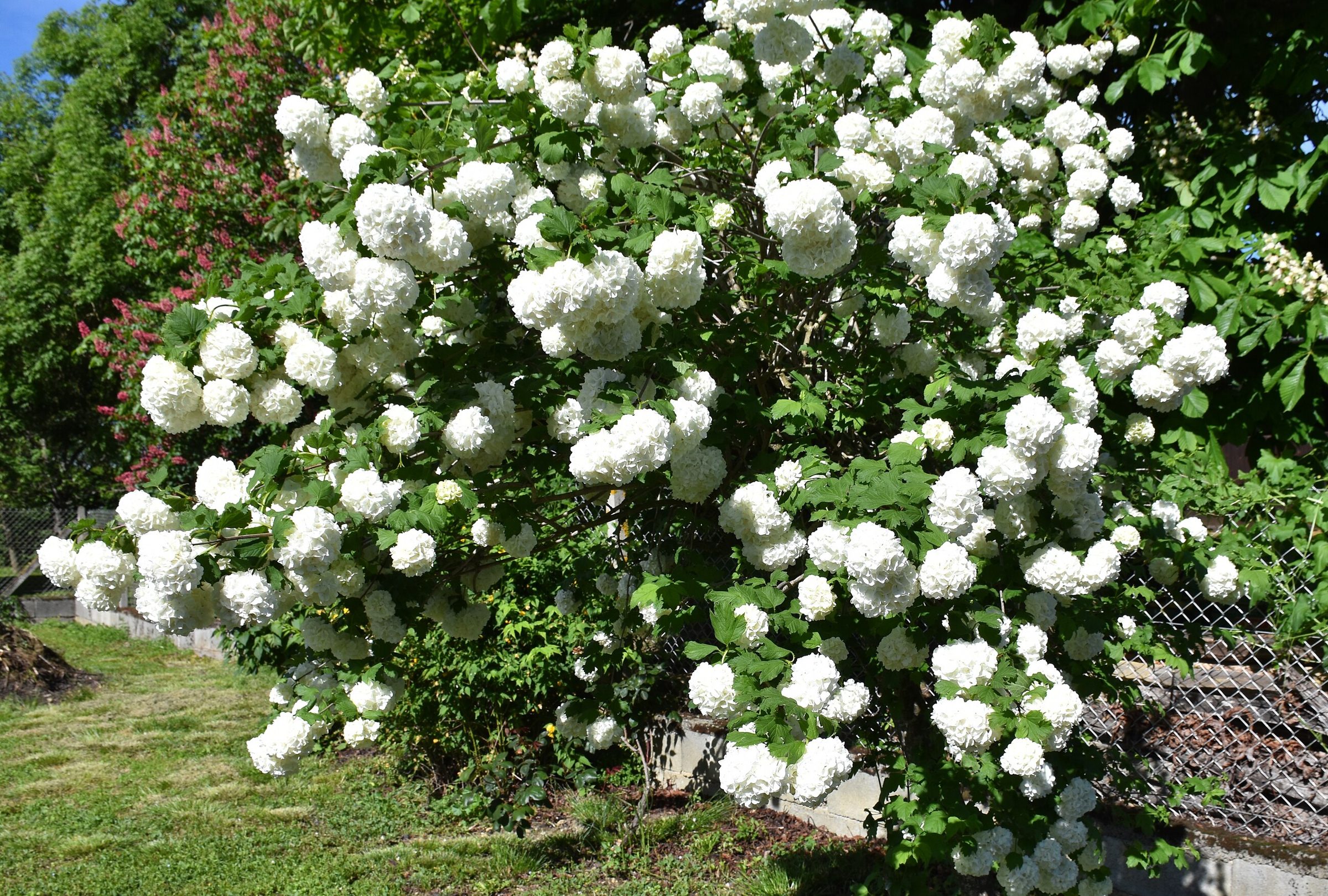 Соцветия щитковидные, плоские, с характерным «венчиком» из крупных краевых стерильных цветков и мелких плодоносящих цветков в центре. Плоды — ярко-красные шаровидные костянки, собранные в кисти.