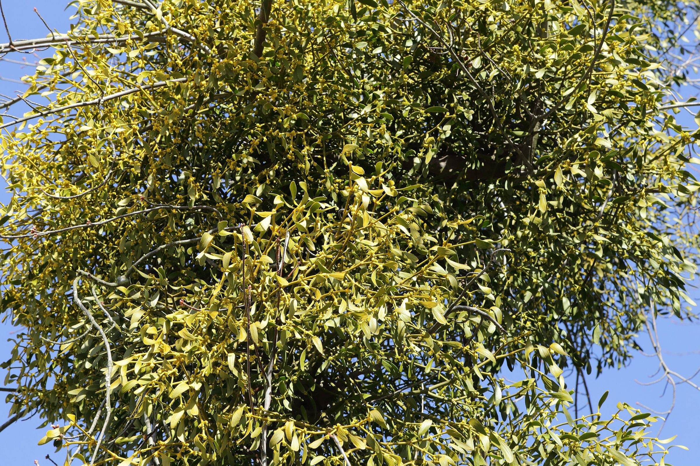 Омела белая — вечнозелёный древесный полупаразит, который закрепляется на ветвях деревьев с помощью «присосок» и образует плотные шаровидные кусты.