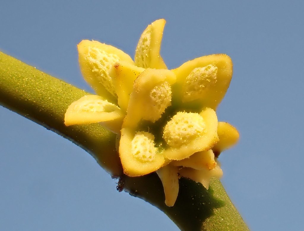Побеги многократно вилкообразно разветвлённые, членистые, длиной обычно 30–100 см. Листья располагаются попарно напротив друг друга, кожистые, цельнокрайние, овальные или продолговатые, желтовато-зелёные.